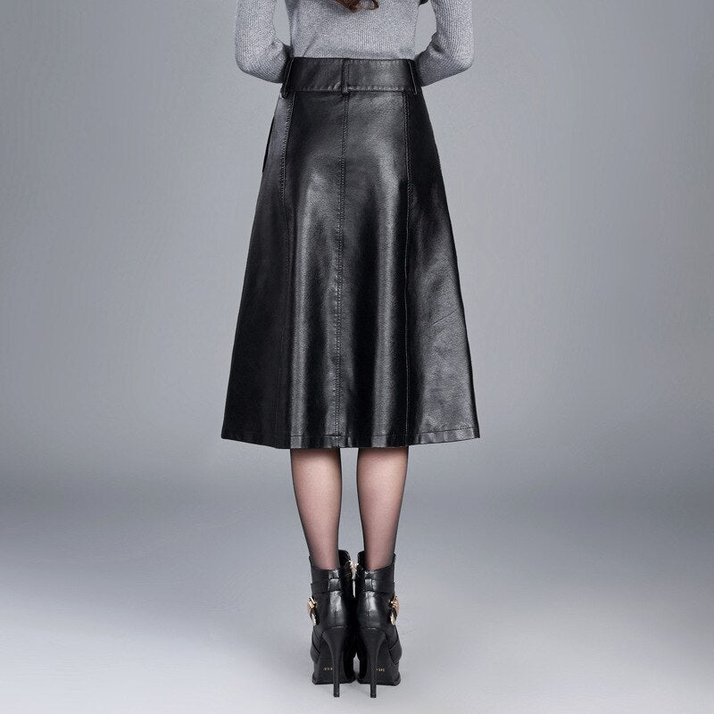 Women A-line PU Leather Skirt New Autumn Winter High Waist Elegant Chic Loose Casual Office Lady Mid-long Skirts Pockets