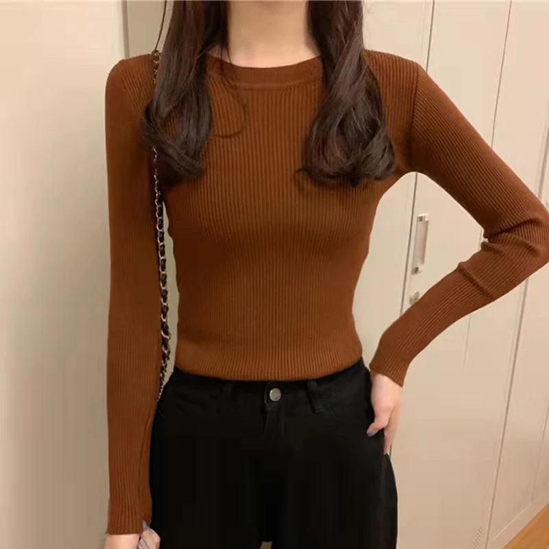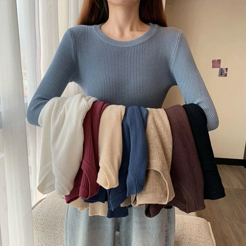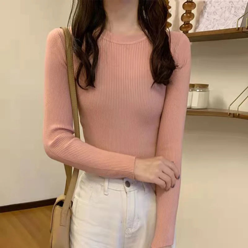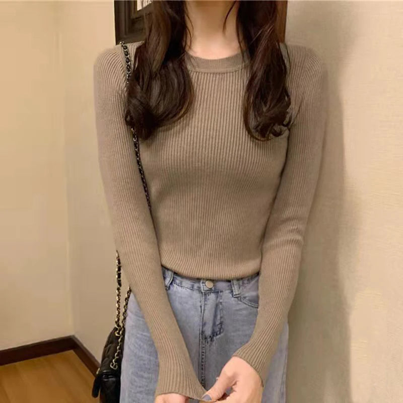 Rimocy Basic Round Neck Knit Sweater Women Spring Autumn Ribbed Long-sleeved Sweaters Woman Solid Color Slim Fit Pull Femme 2022