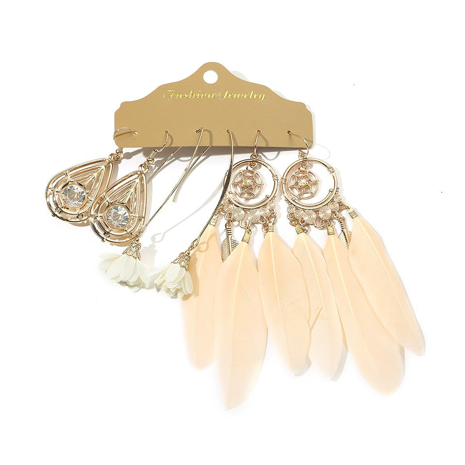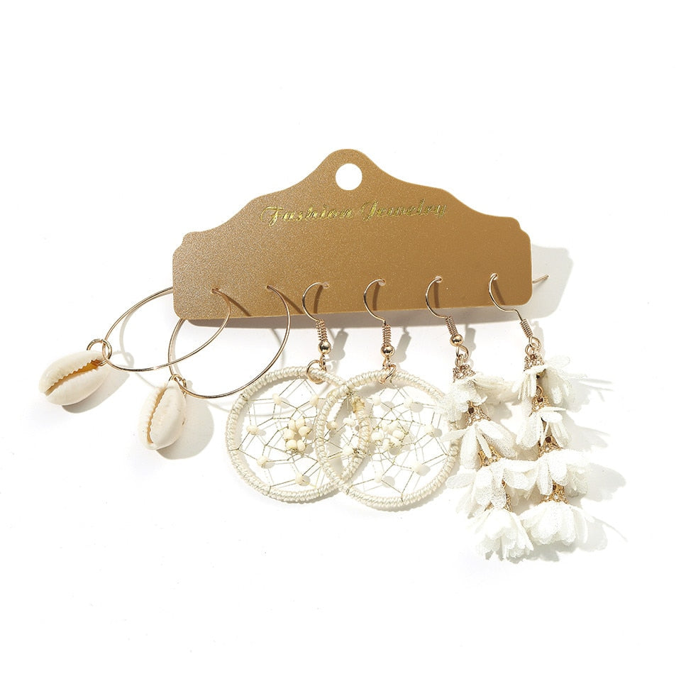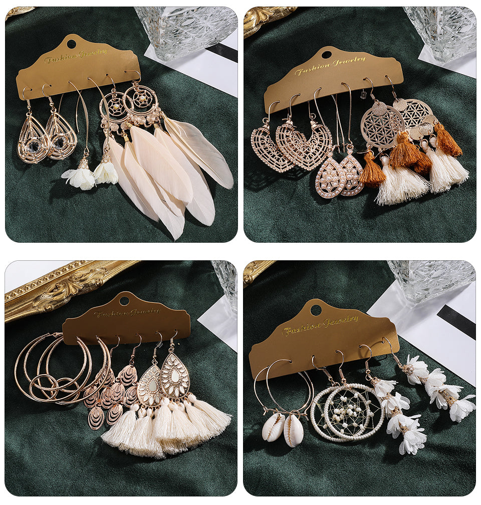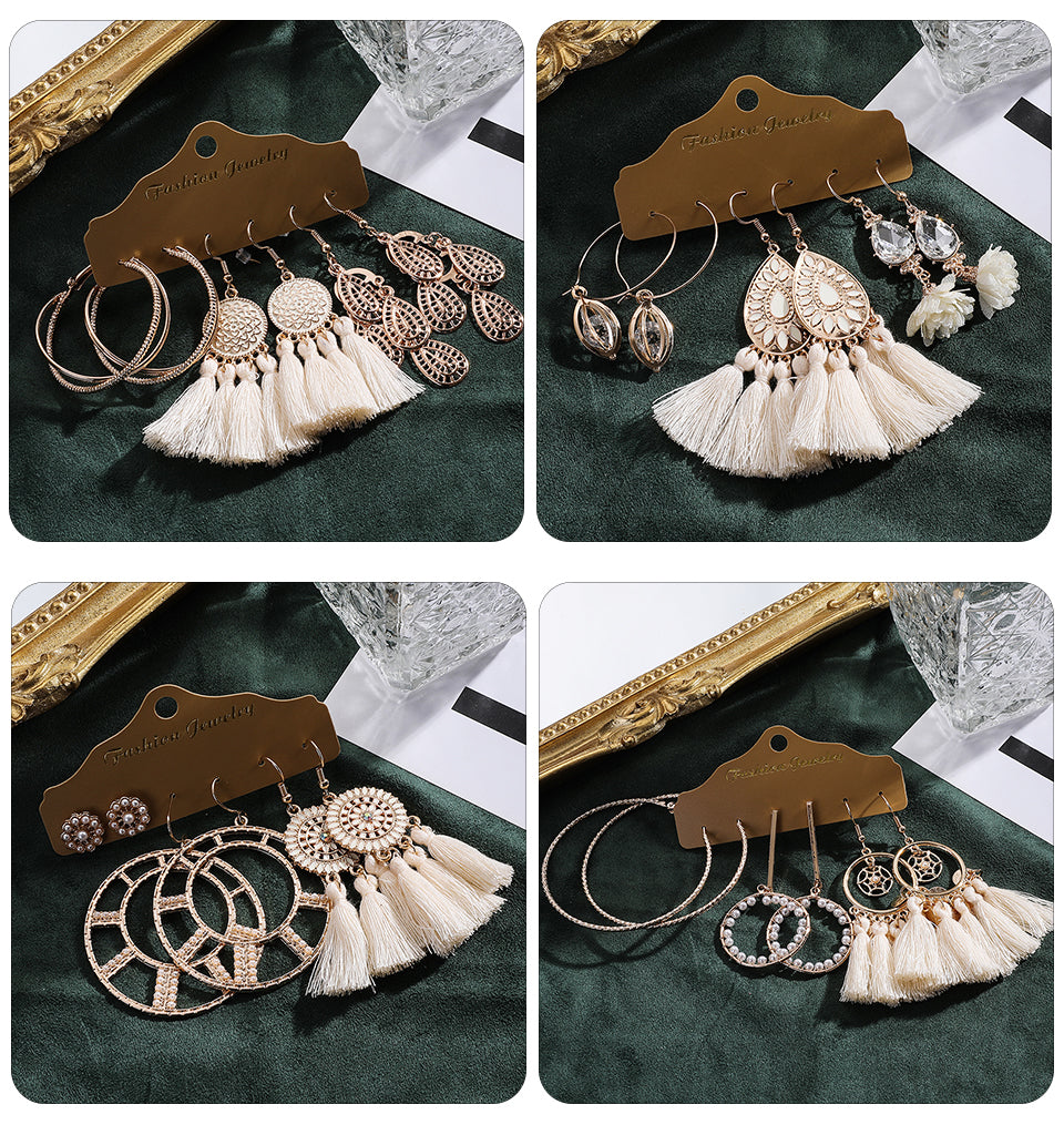 Big Round Beige White Tassel Earrings Set Ethnic Vintage Bohemian