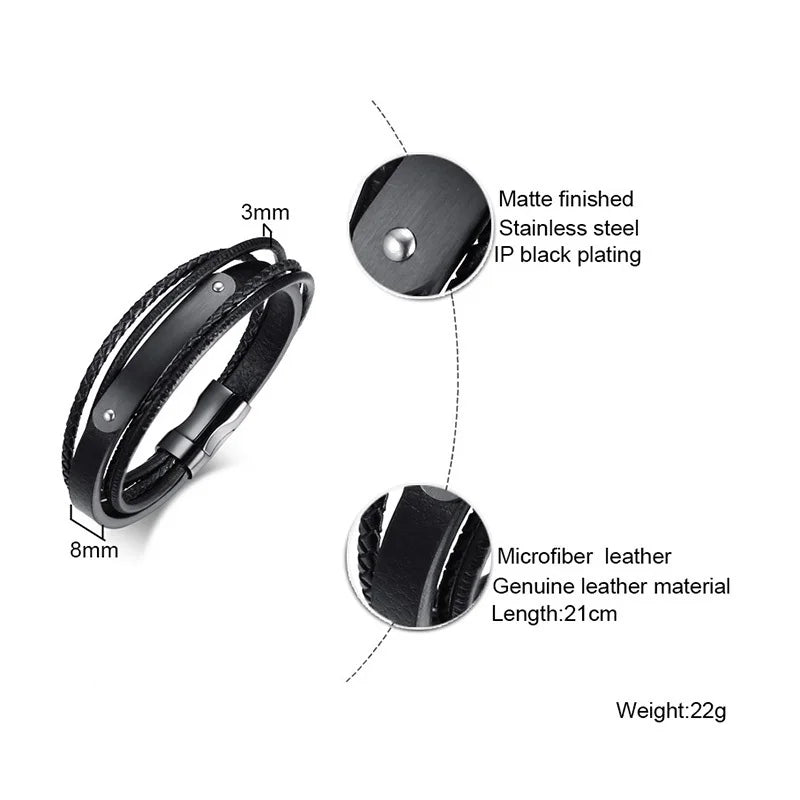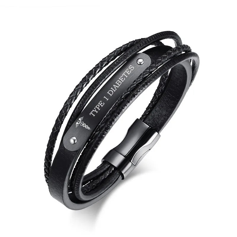 Black Genuine Leather Bracelet Men Jewelry Emergency Free Engraving ICE Medical DIABETES 8.3"