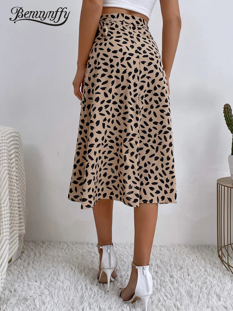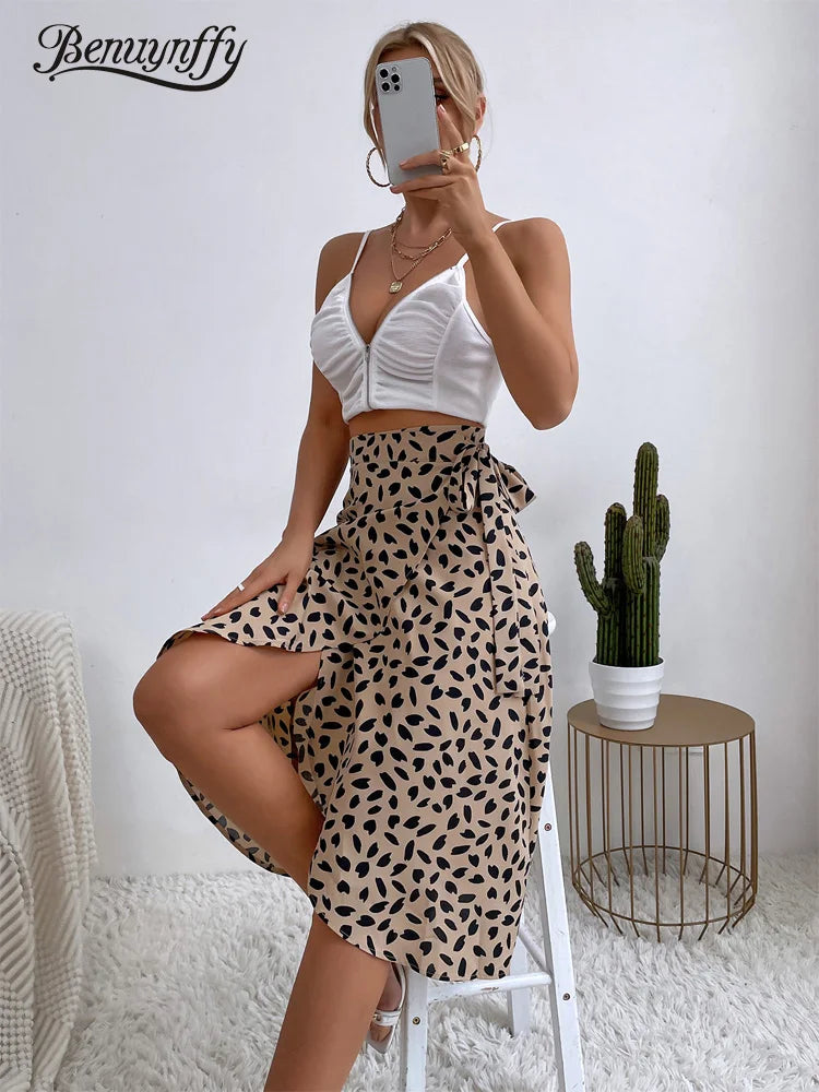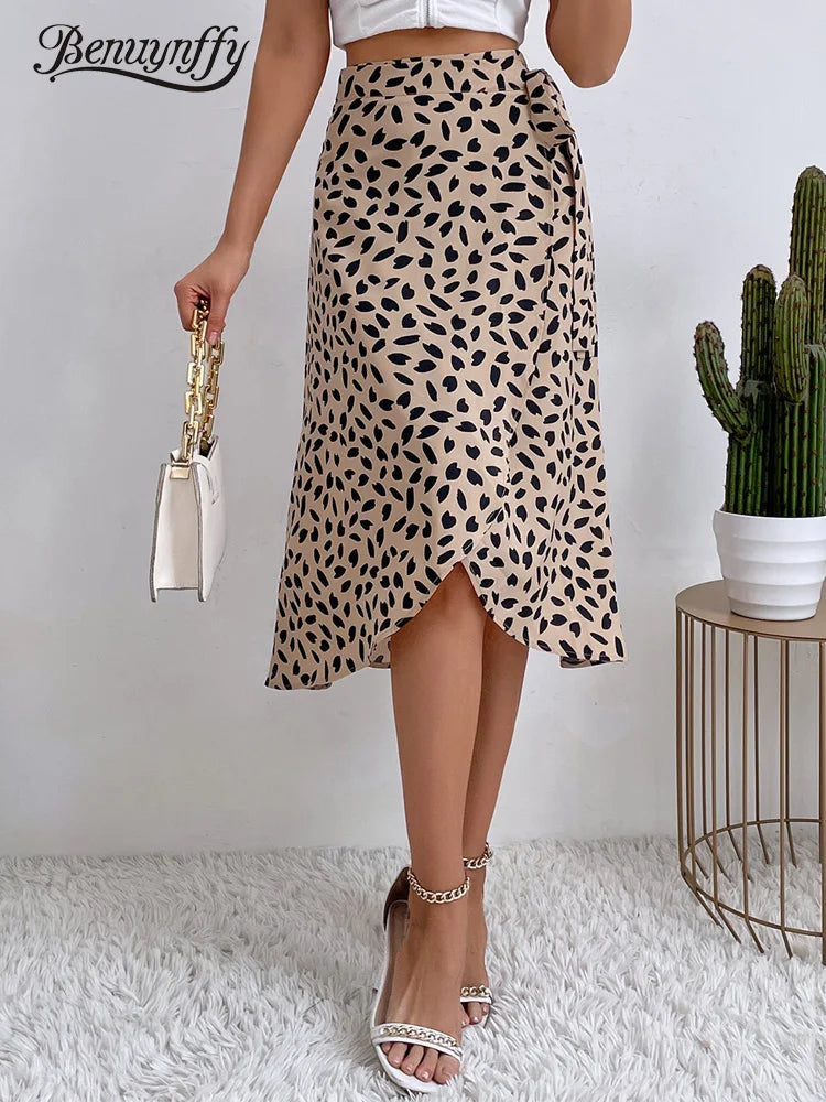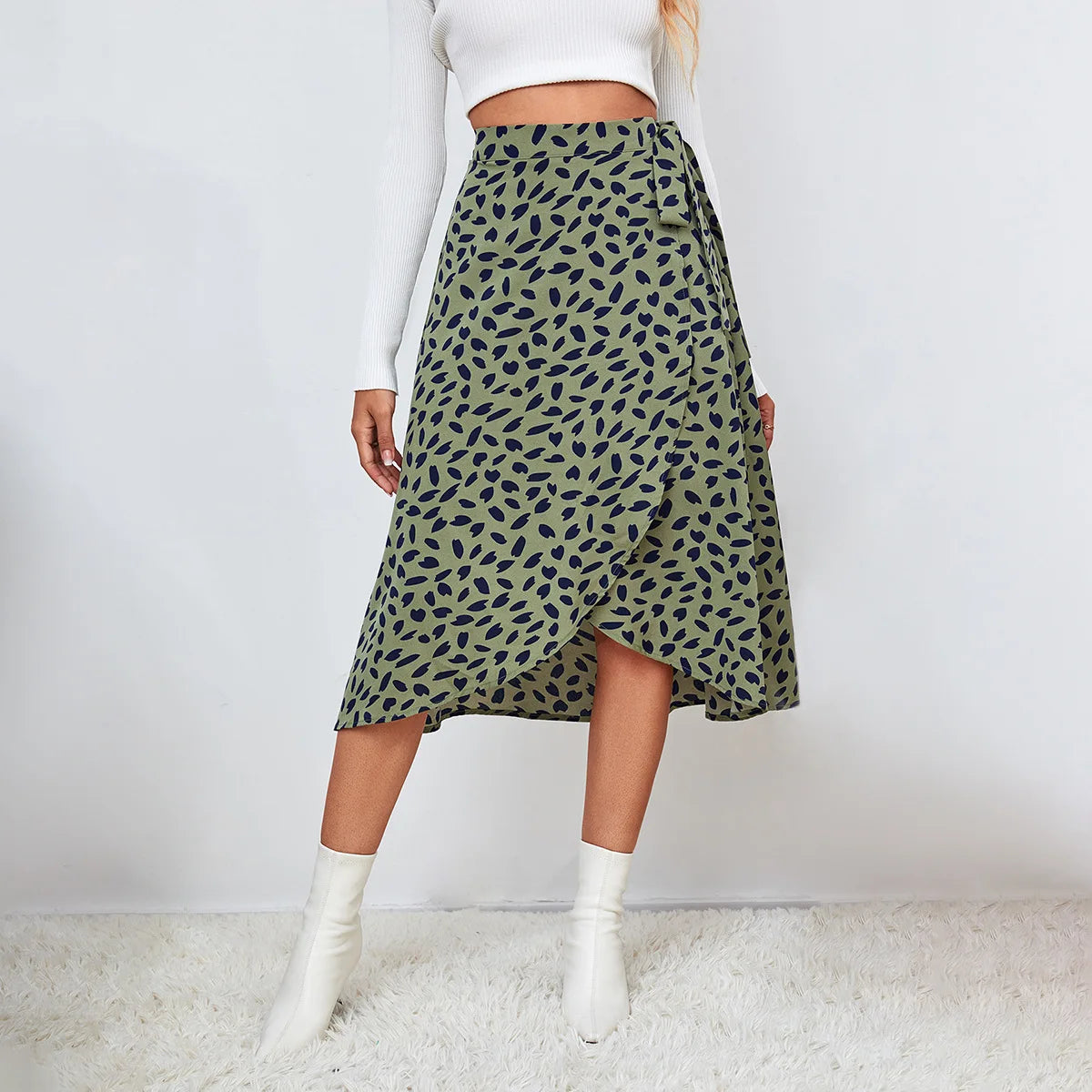 Boho Women Casual Print Tie Side Wrap Skirt Elegant High Waist Female Summer Asymmetrical Knee Length A-Line Skirts