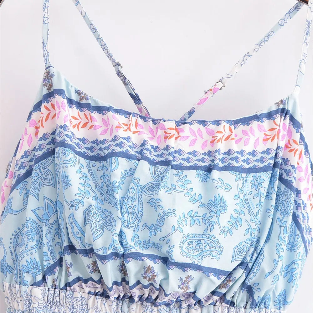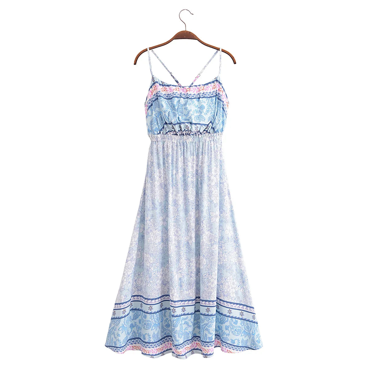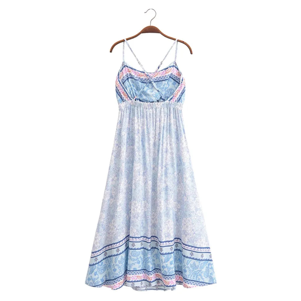 2024 BOHO Contrast Color Blue White Floral Print Backless Sling Dress Holiday Woman Cross Strap Back Robe Beach Vestidos Holiday