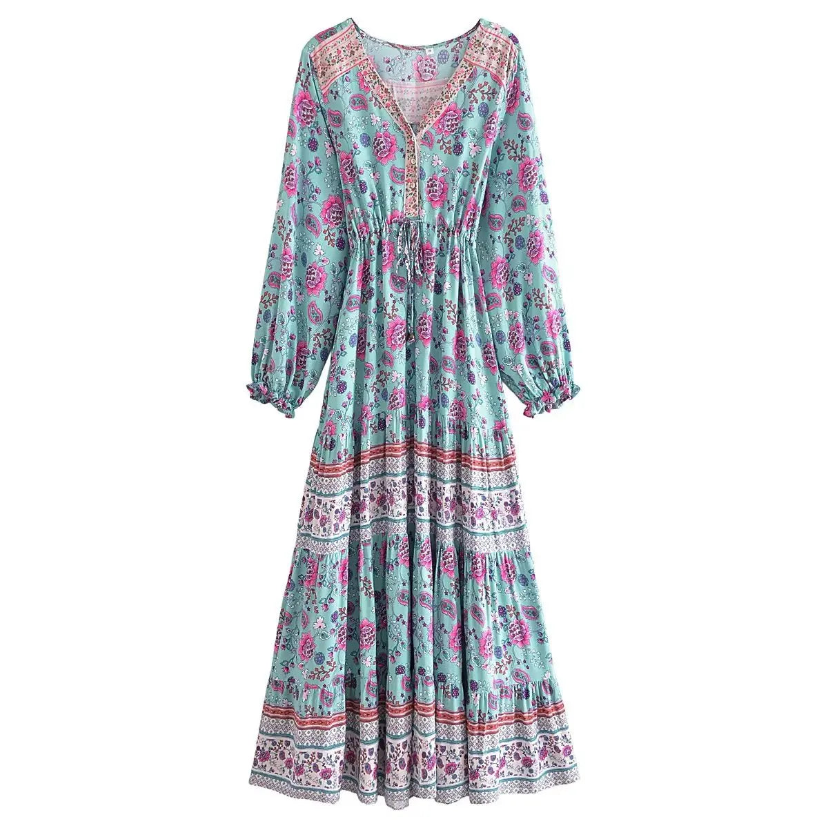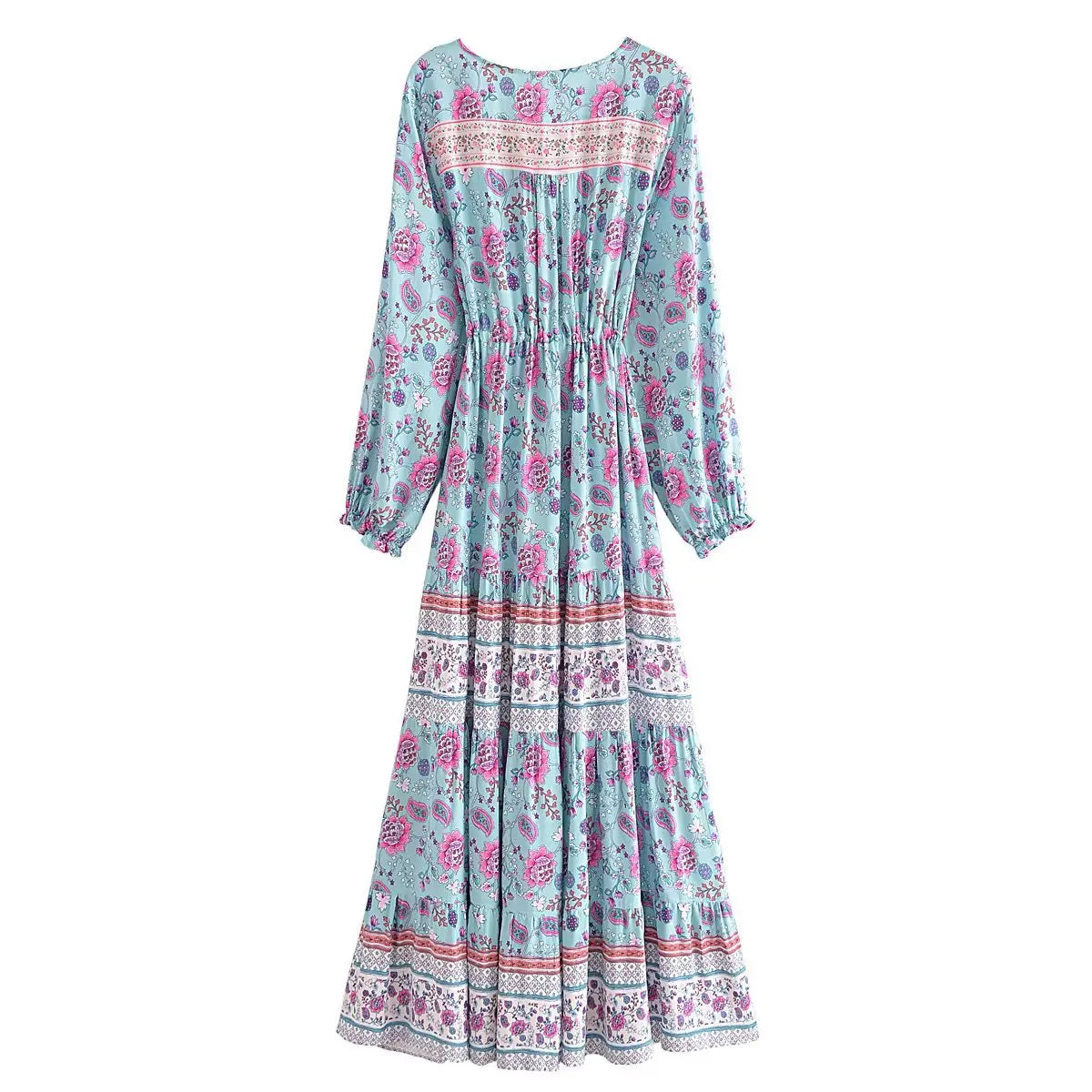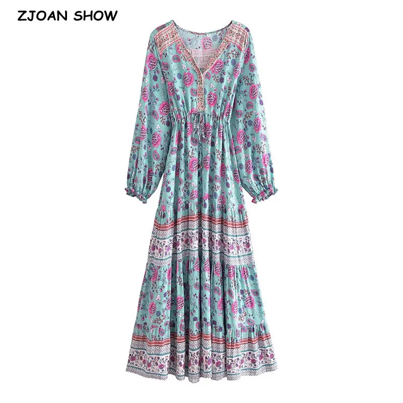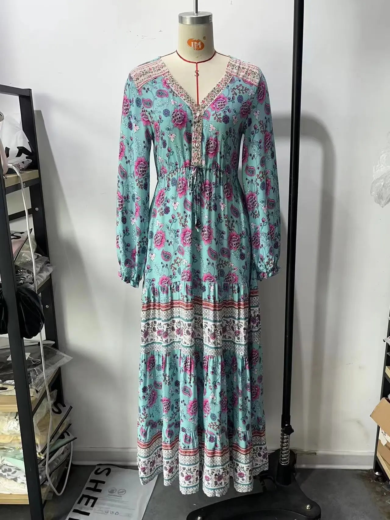2023 BOHO Contrast Color Flower Print Women Long Sleeve Dress Button V neck Tie Bow Waist Spliced Ruched Hem Holiday Maxi Robe