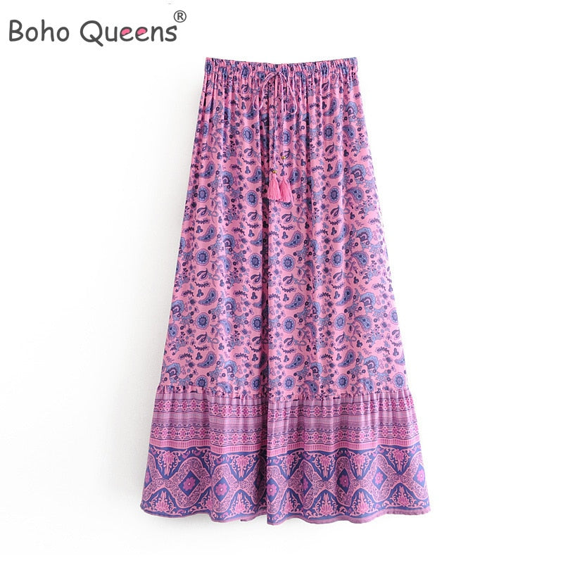 Boho Fashion Women Beach Bohemian Floral Print Pleated Rayon Skirt Elastic High Waist Maxi A-Line Skirt Femme