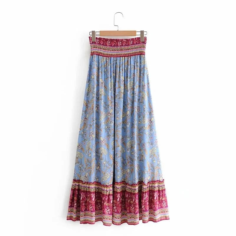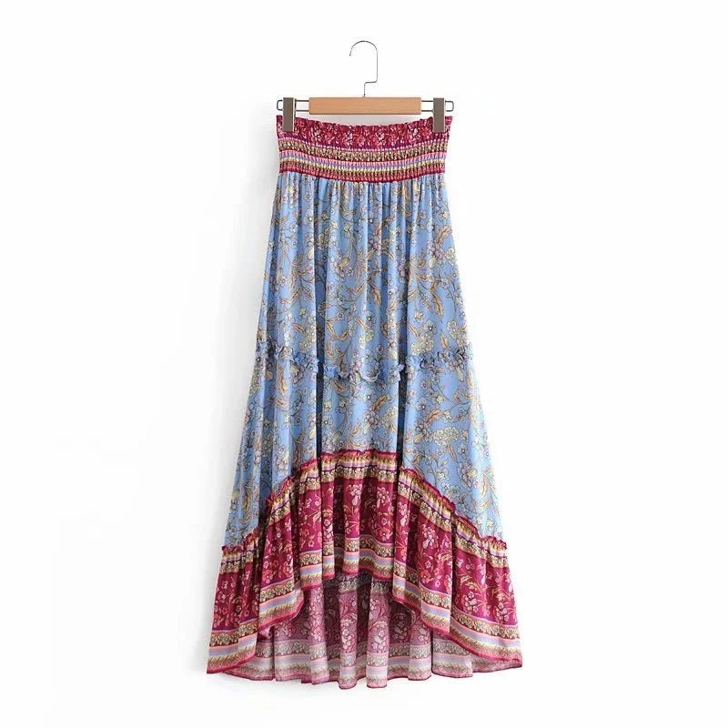 Boho Fashion Vintage Women Beach Bohemian Floral Peacock Print Skirt High Elastic Waist Maxi A-Line Skirts Femme
