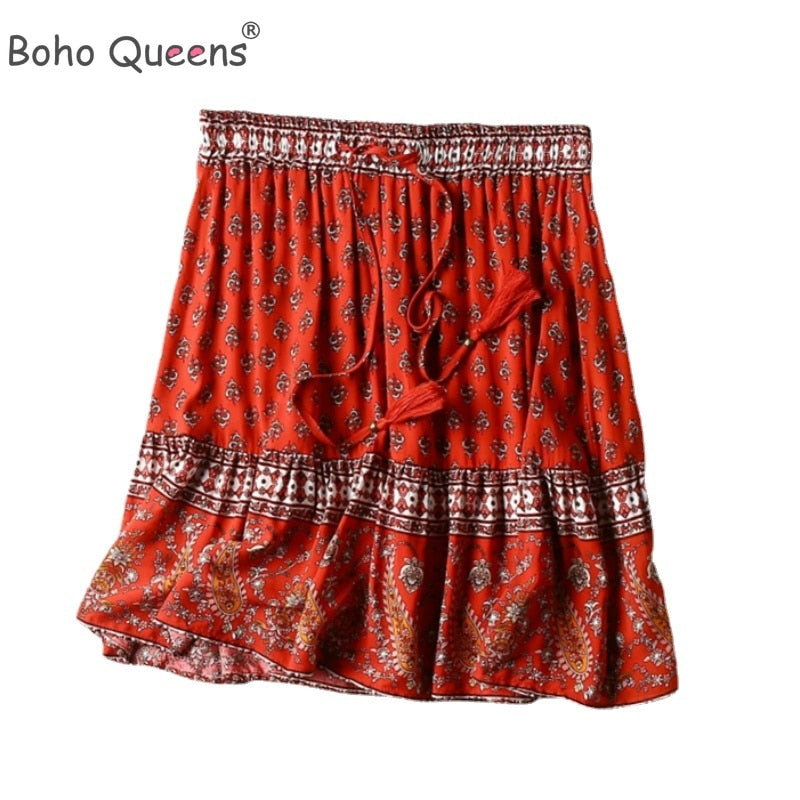 Hippie Women Red Floral Printed Beach Bohemian Skirt Ladies Rayon Cotton Elastic Waist Mini Boho Skirts