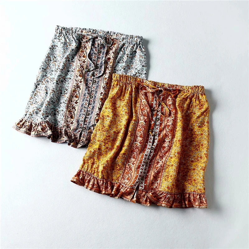 Boho Hippie Women Floral Printed Beach Bohemian Short Skirt Ladies Rayon Cotton Elastic Waist Mini Boho Skirts