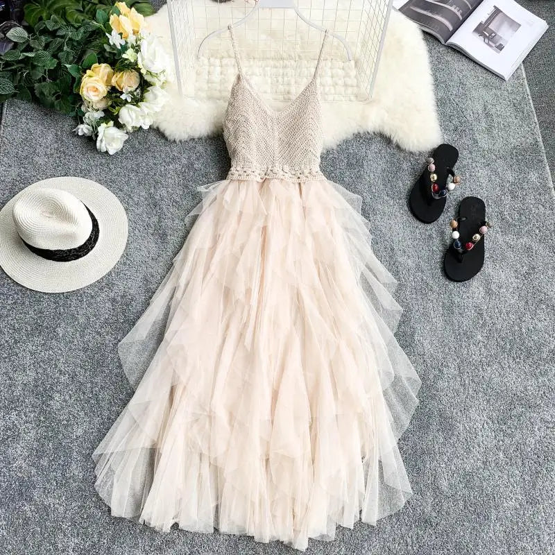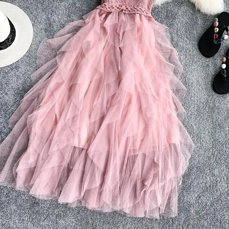 Boho Knit Patchwork Mesh V Neck Spaghetti Strap Summer Midi Long Dress Party Women Casual Beach Holiday Irregular Vestidos