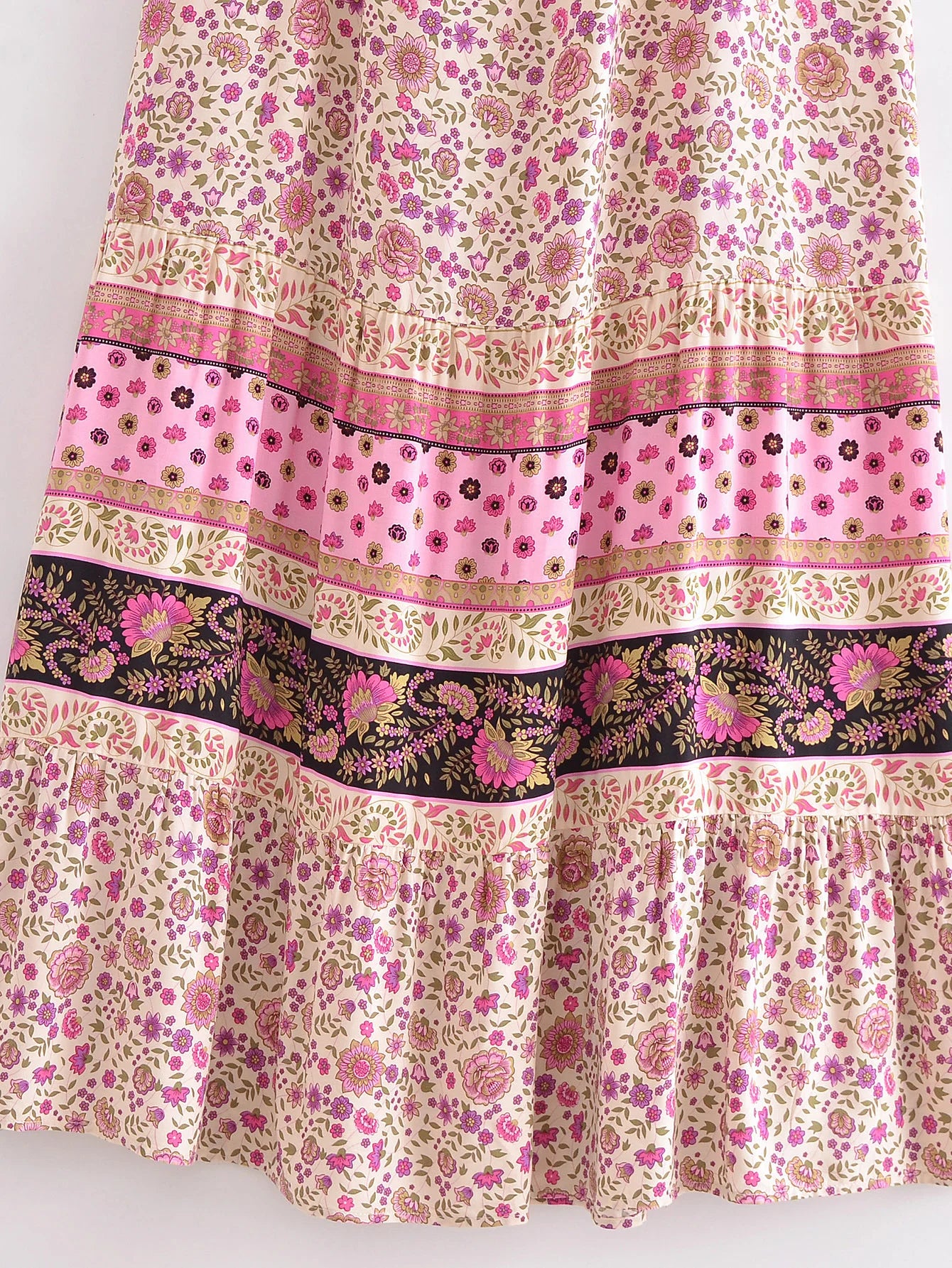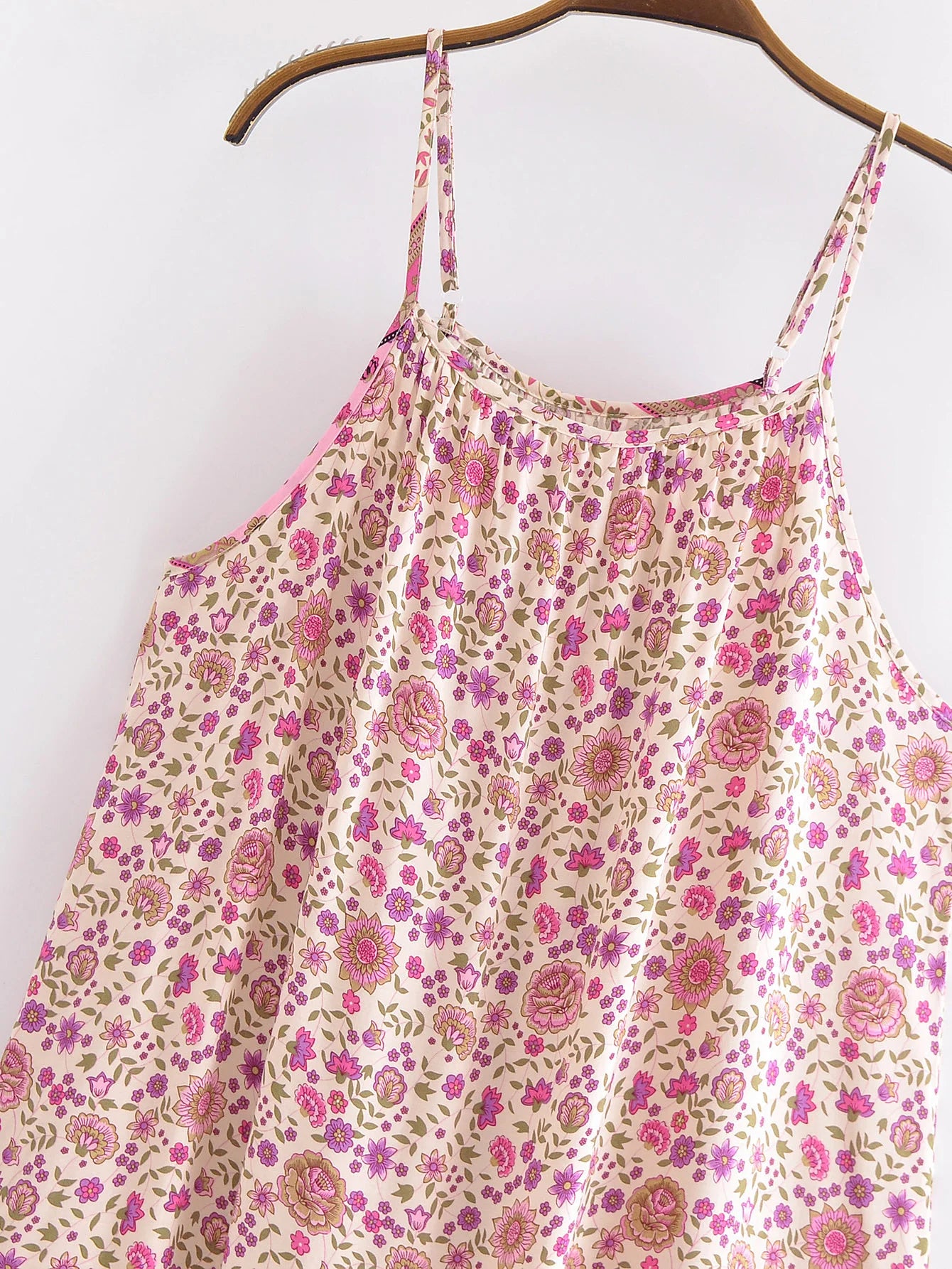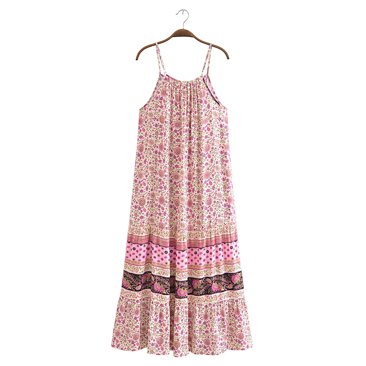 2023 BOHO Pink Contrast Color Flower Print Midi Long Sling Dress Women Loose Ruched Hem Swing Swing Robe Holiday Green