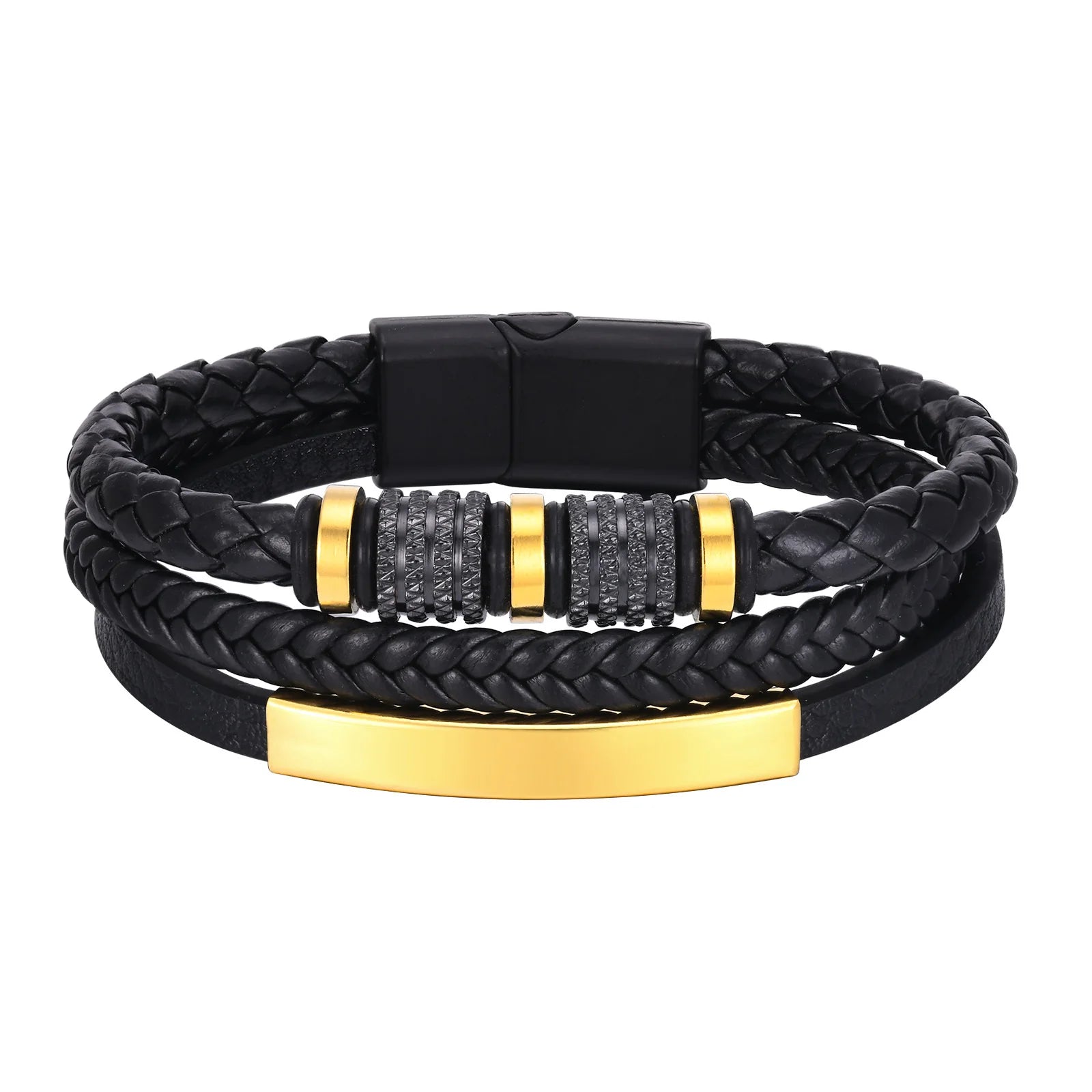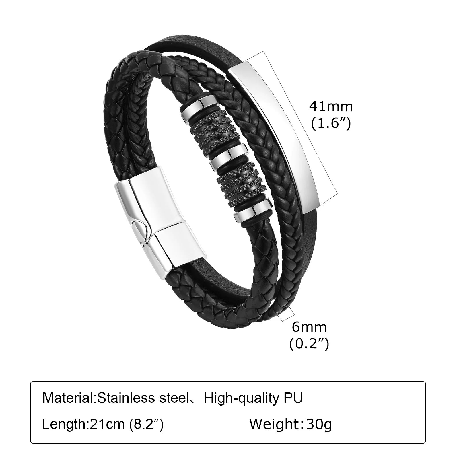 Vnox Personalized Bracelets for Men Boys, Black Braided PU Leather Bangle with Metal Tube Charm, Custom Gentle Gift for Him