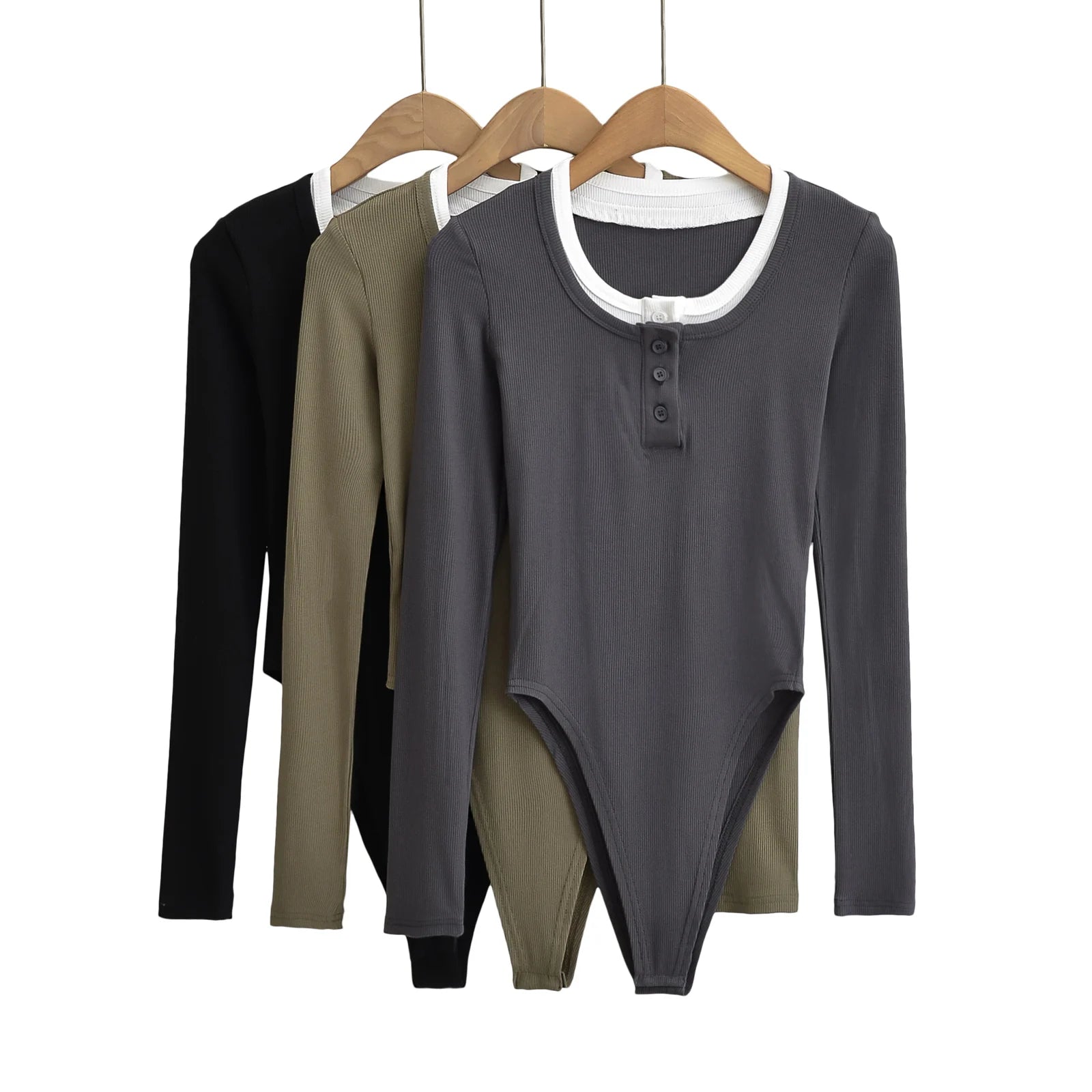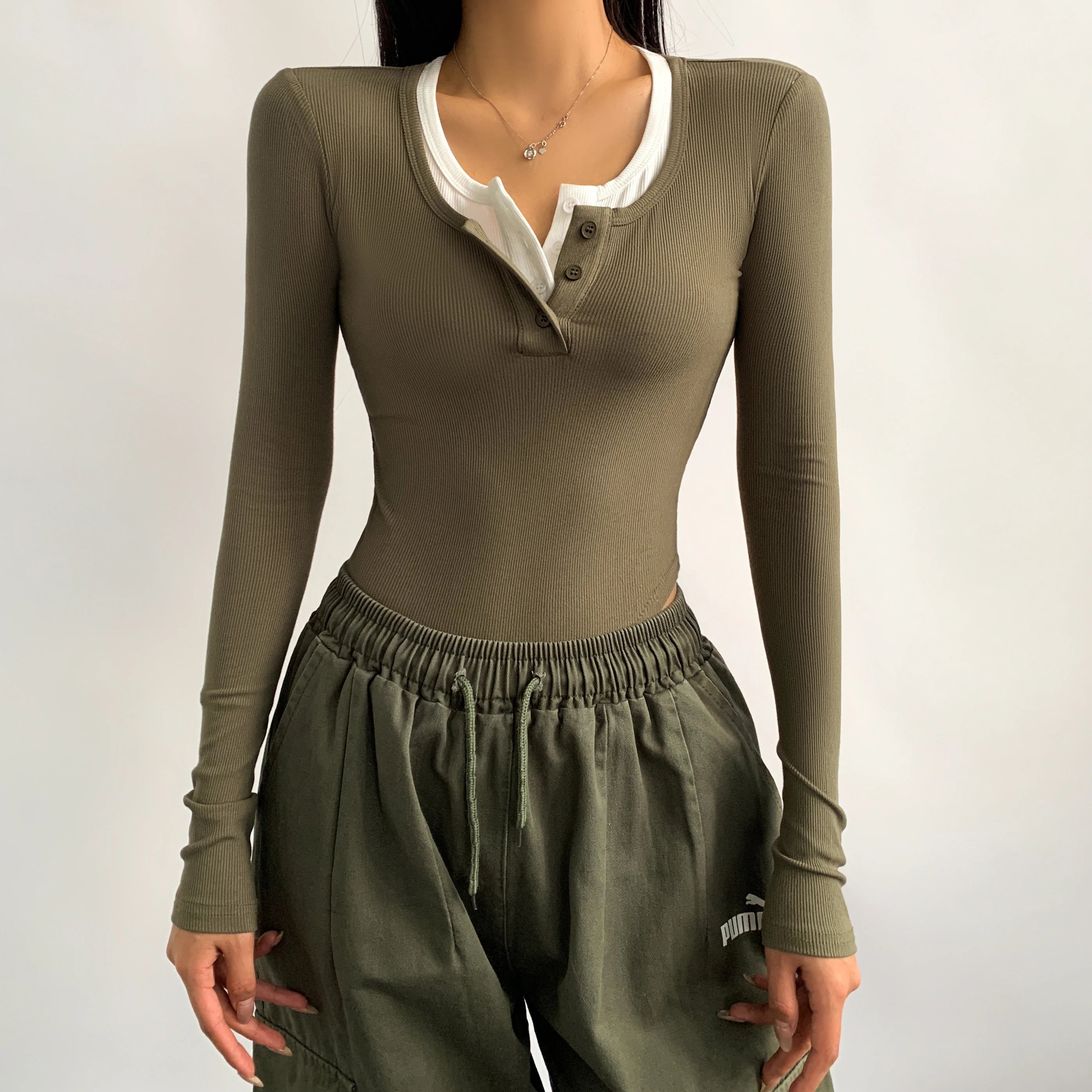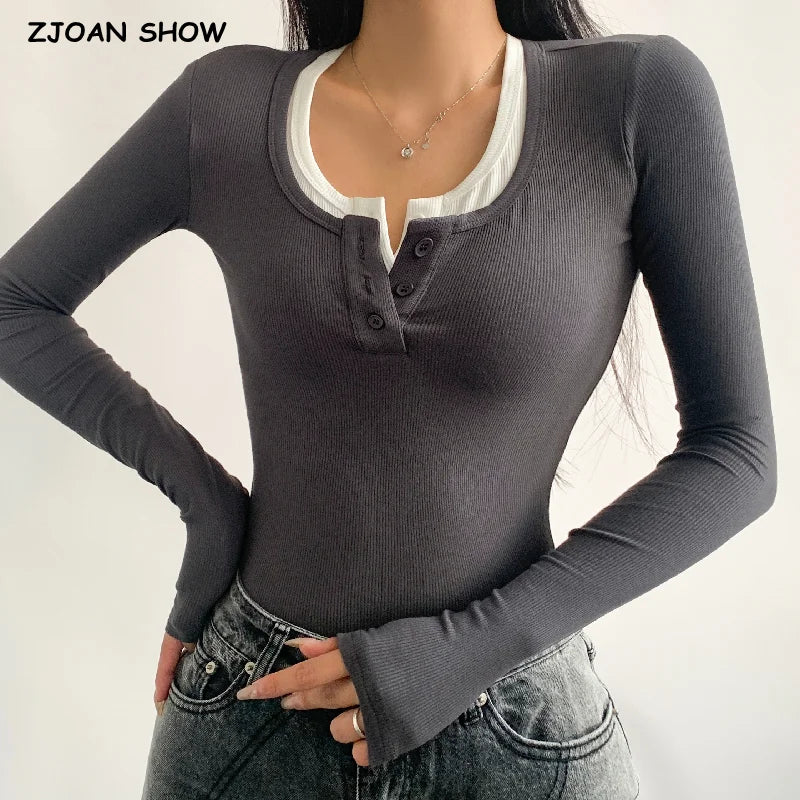 90'S False 2 pieces Open Buttons O neck Rib Long sleeve Bodysuit Woman Short Jumpsuit Slim fit Rompers Bodycon Playsuits