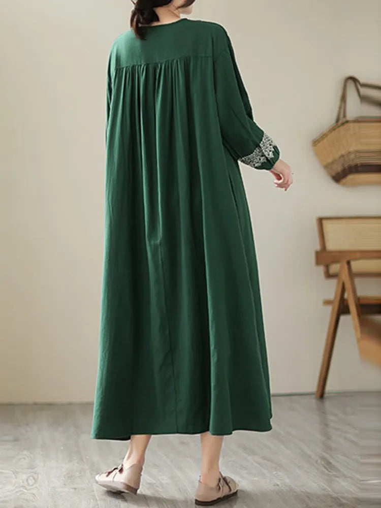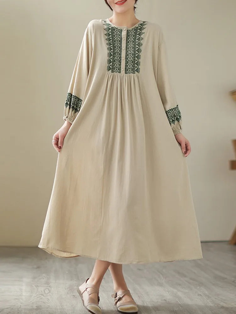 100% Cotton Long Dresses Women New Arrival 2023 Spring Vintage Style Geometric Embroidery Loose Female Casual Dress B2386