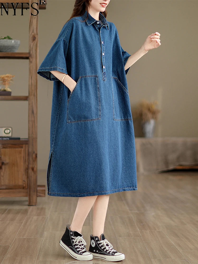 NYFS 2024 Summer New Korea Woman Denim Dress Vestidos Robe Elbise Loose Plus Size Short Sleeve POLO Neck Jeans Dress