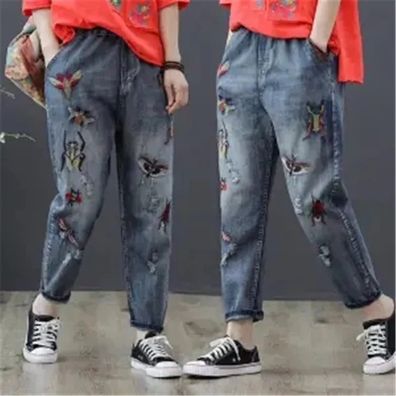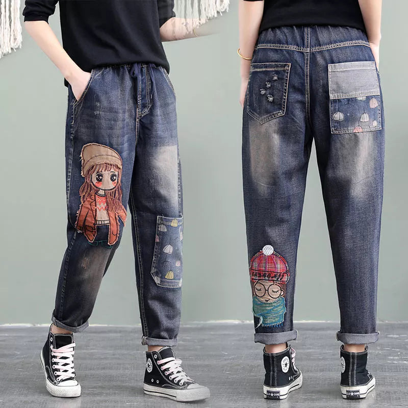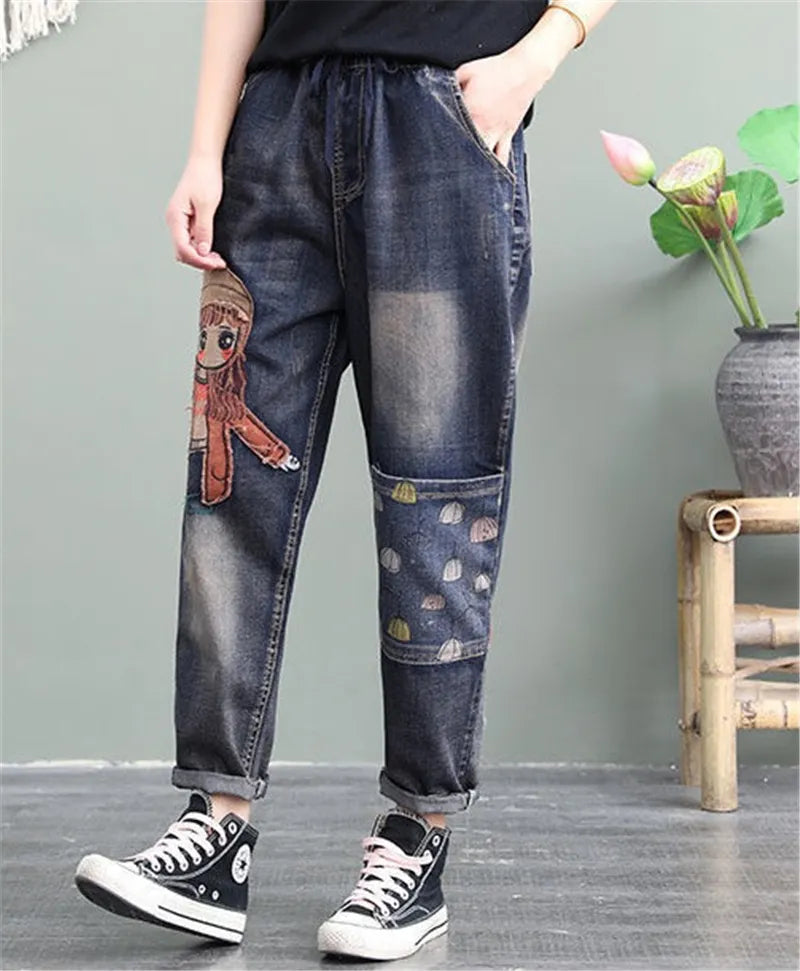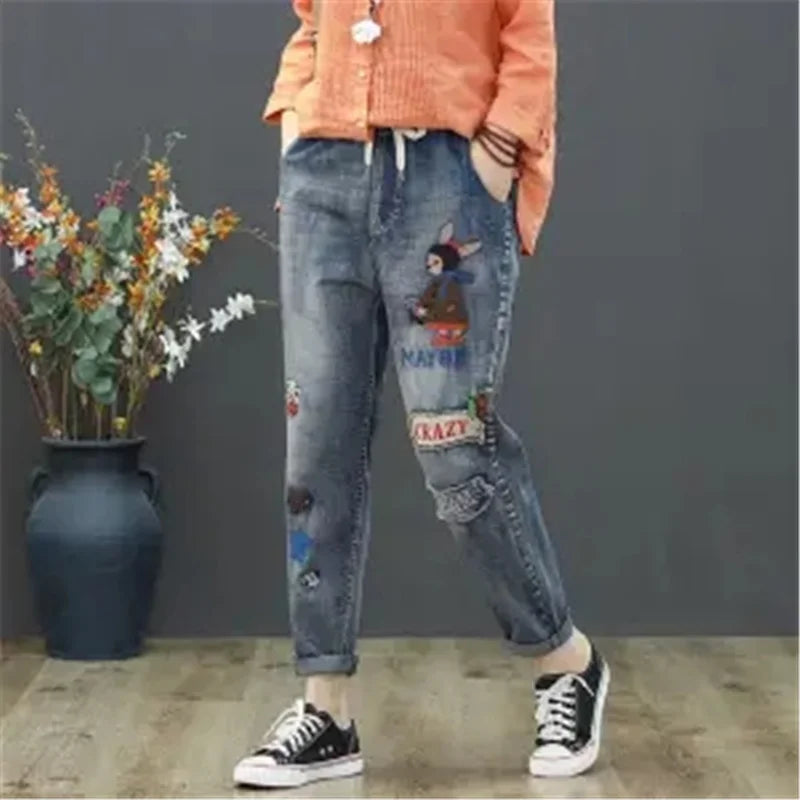 Elastic Waist Jeans Spring Summer Korean Retro Jeans Female Cartoon Girl Patch Pocket Embroidery Distressed Harem Pants Women