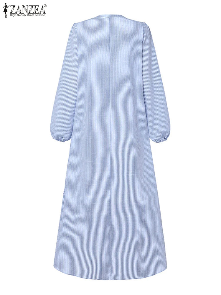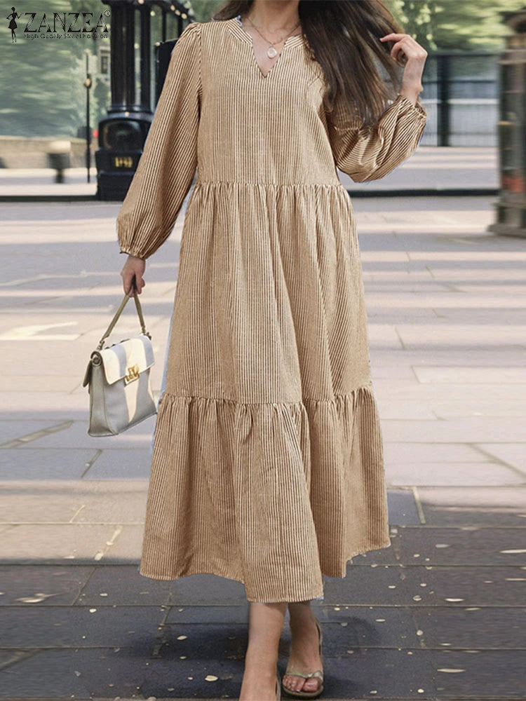 Elegant V Neck Long Sleeve Dress Striped Sundress Pleated Midi Robe Fashion