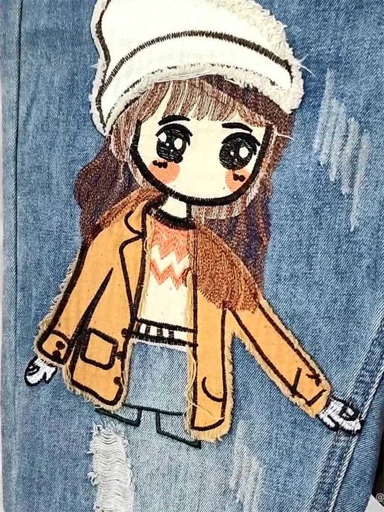 6537 Cartoon Litter Girl Embroidery Denim Pants For Women Trendy Hole Casual High Waist Breeches Pockets Mom Harem Blue Jeans