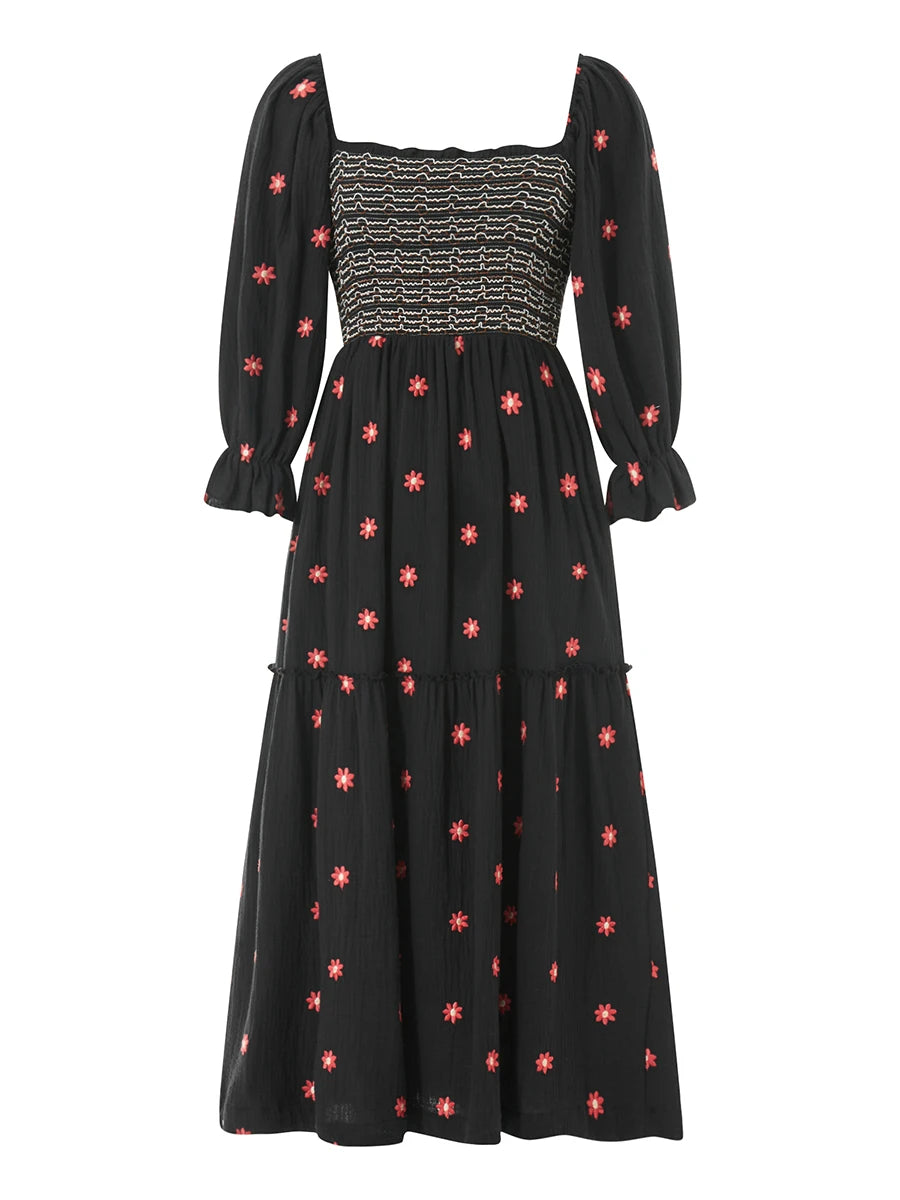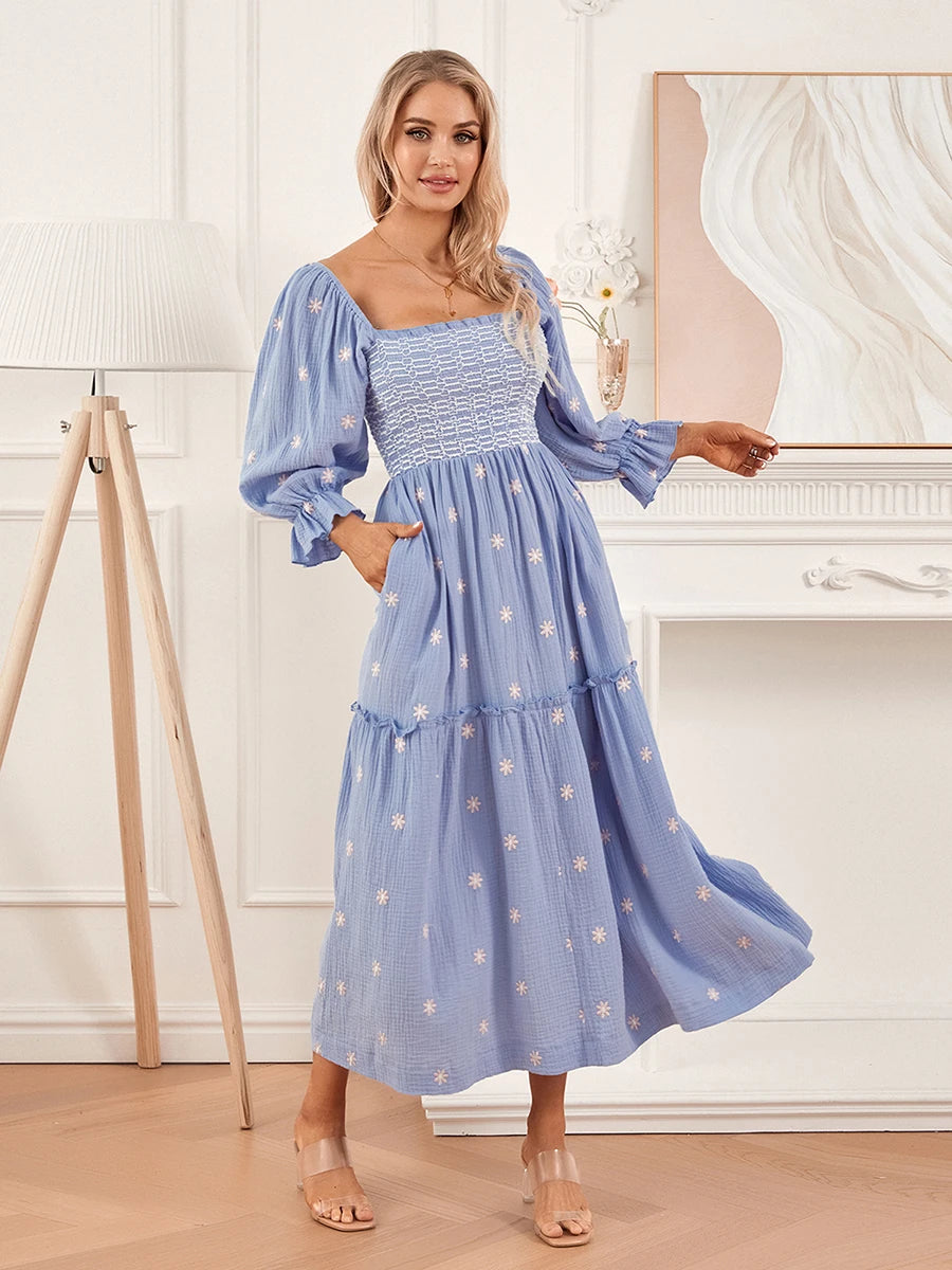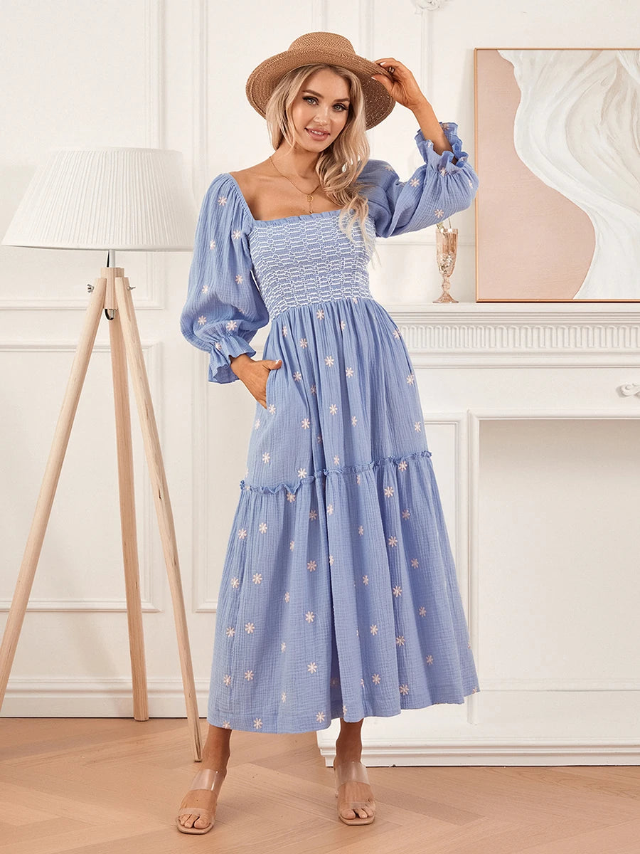 wsevypo Autumn Embroidery Flower Flowy Hem A-Line Dress Women's Puff Long Sleeve Square Neck Casual Long Dress for Beach Holiday