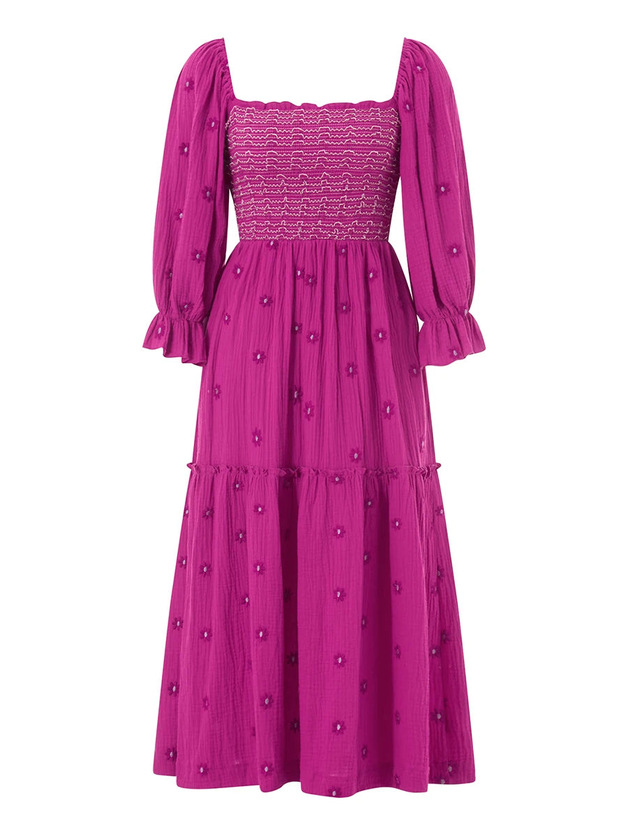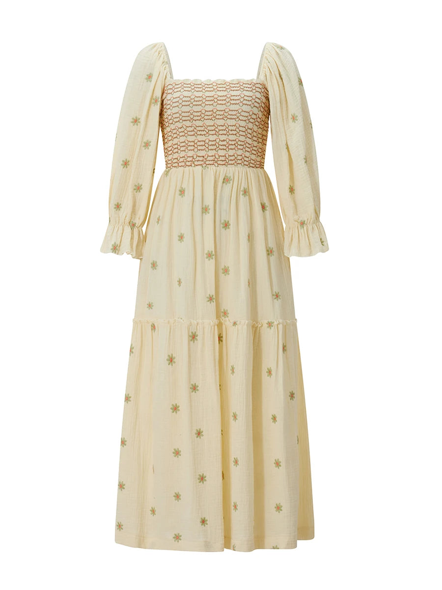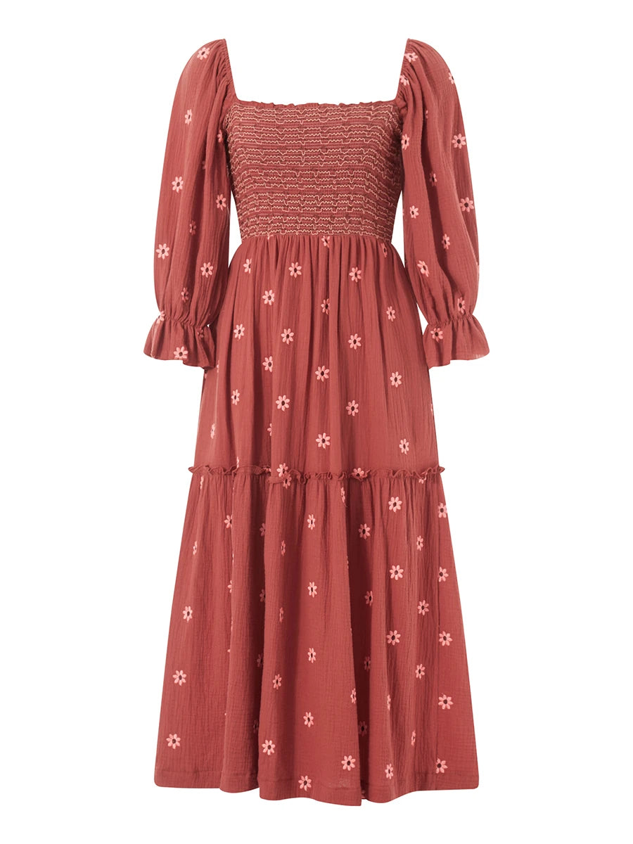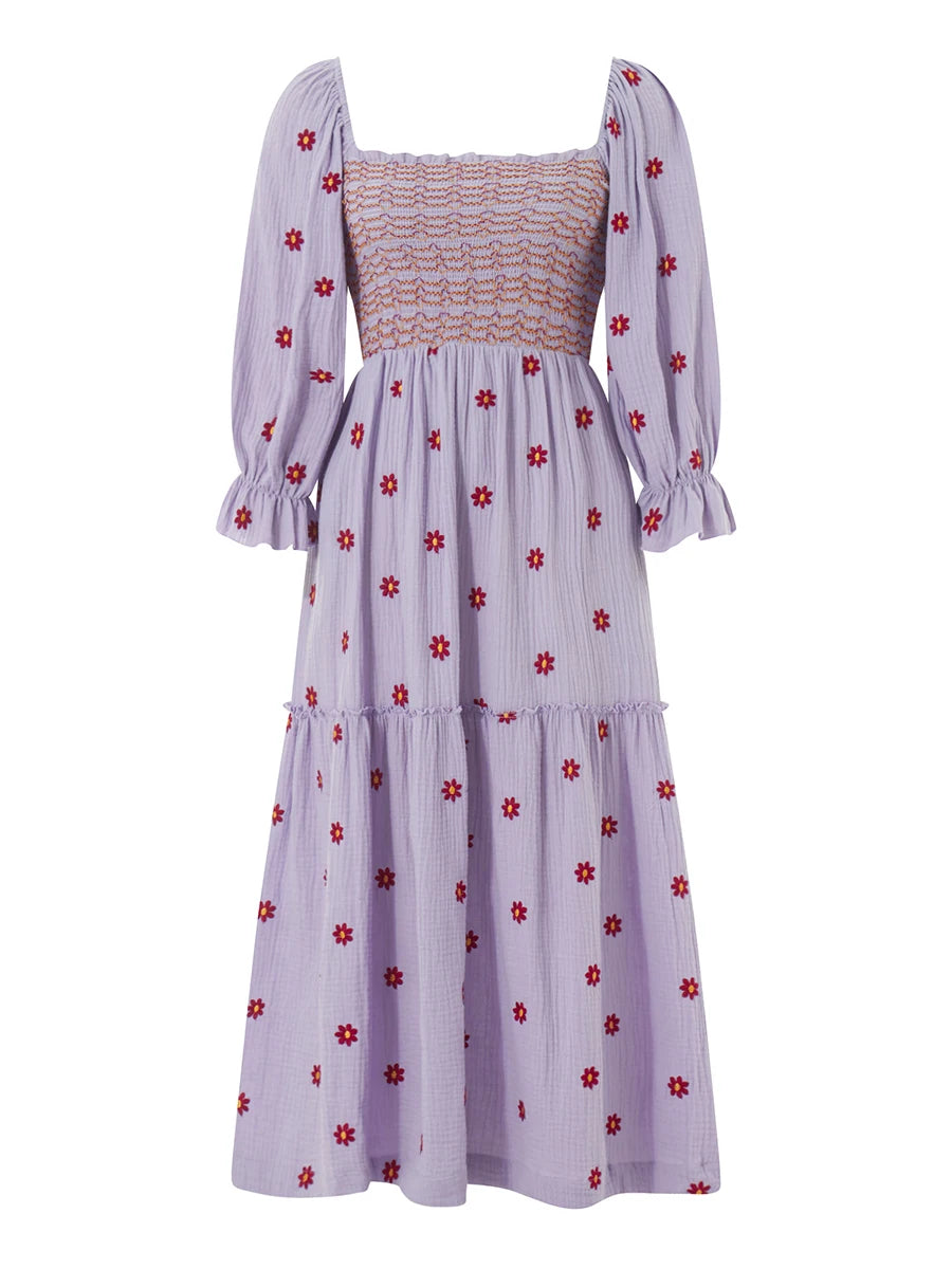 wsevypo Autumn Embroidery Flower Flowy Hem A-Line Dress Women's Puff Long Sleeve Square Neck Casual Long Dress for Beach Holiday