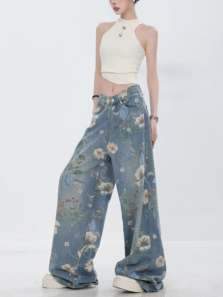Fashion Printed Jeans 2024 Retro Floral Denim Mopping Trousers Korean Style High Street Loose Hip Hop Wide-leg Jean Pants