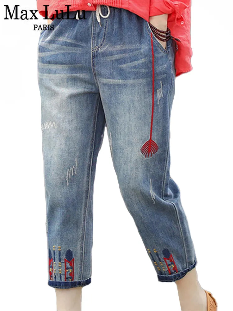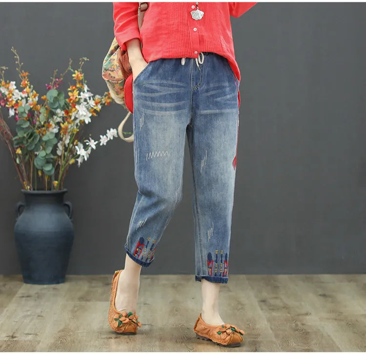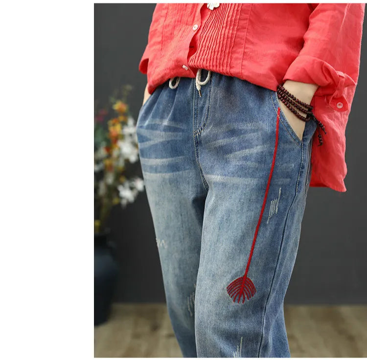 Fashion Summer Ladies Ripped Loose Jeans Women Casual Embroidery Denim Trousers Vintage Female Elastic Harem Pants
