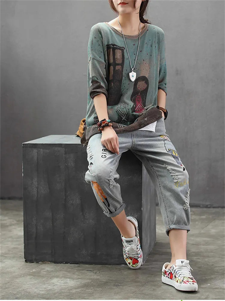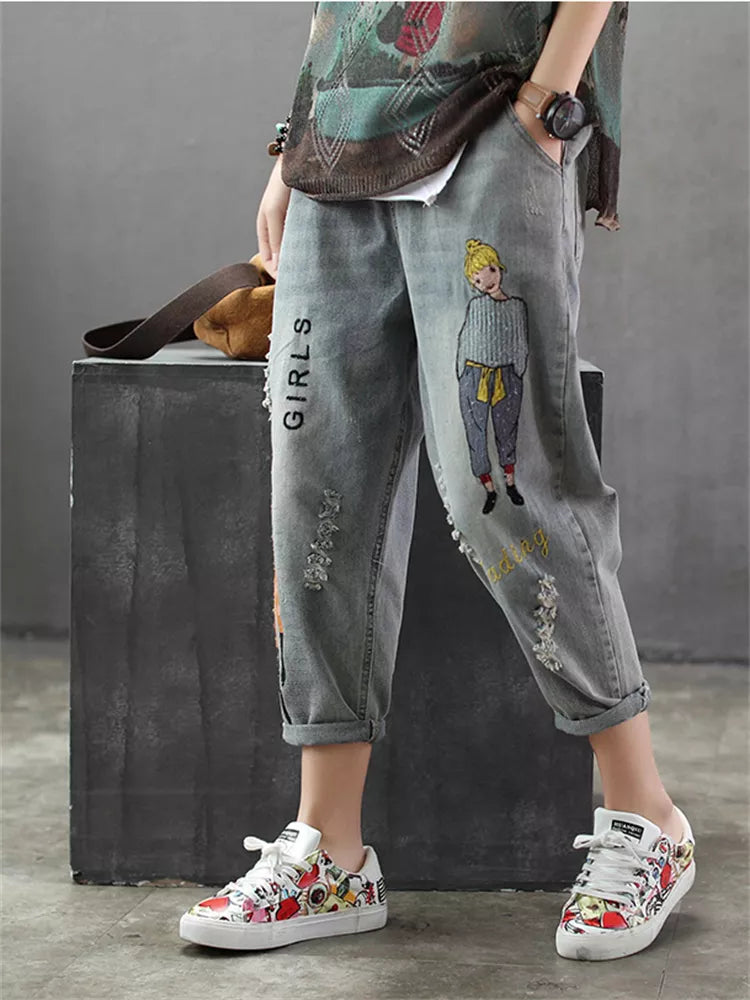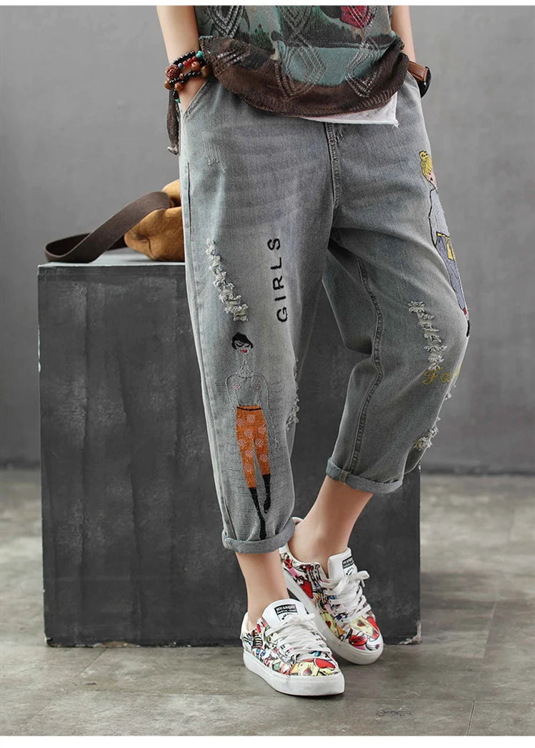 Fashion Korea Style Vintage Hole Girl Embroidery Ankle-length Denim Jeans Female Casual Loose Harem Pant Trousers Cloth
