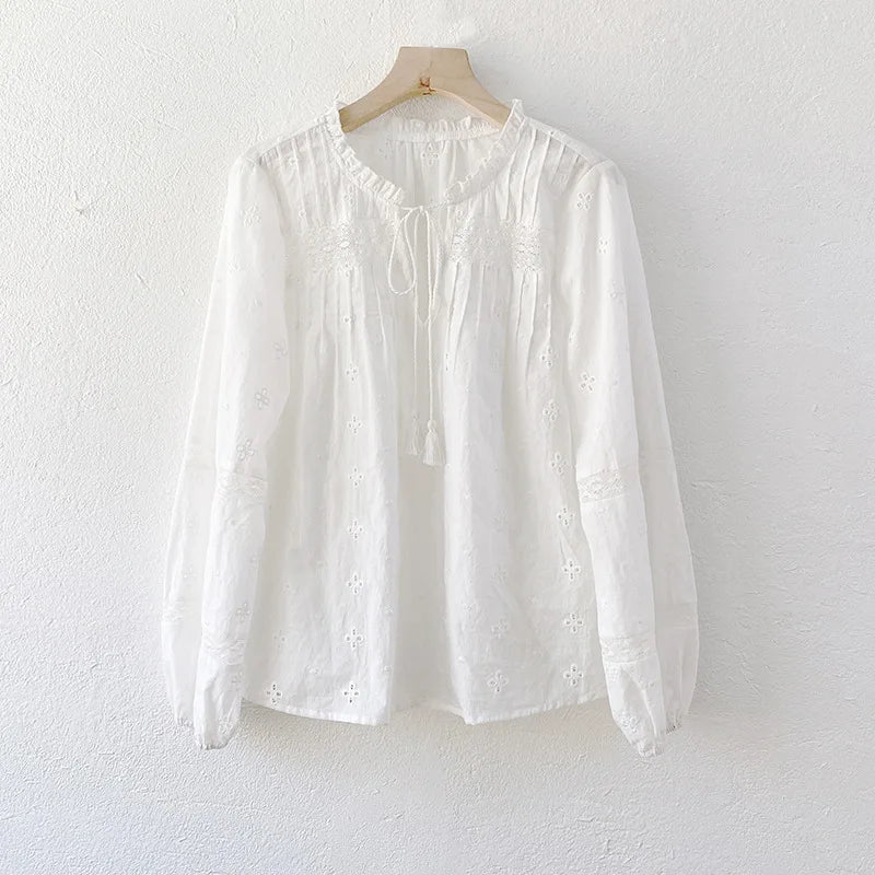 TEELYNN 100%Cotton Floral Embroidery White Lace Blouse shirt For Women Vintage V Neck Long Sleeve Autumn Blusas Boho Tops 2023