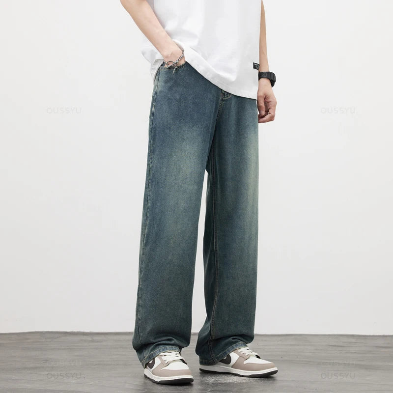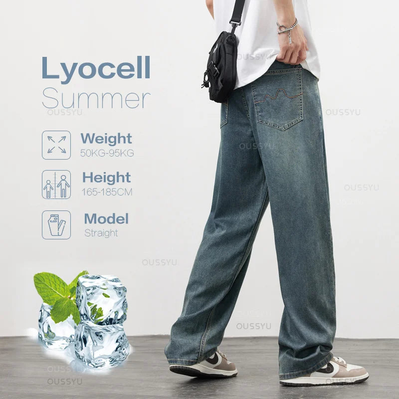 New Upgrade High Quality Soft Lyocell Fabric Jeans Men Summer Thin Loose Wide Leg Casual Pants Blue Retro Style Trousers Male