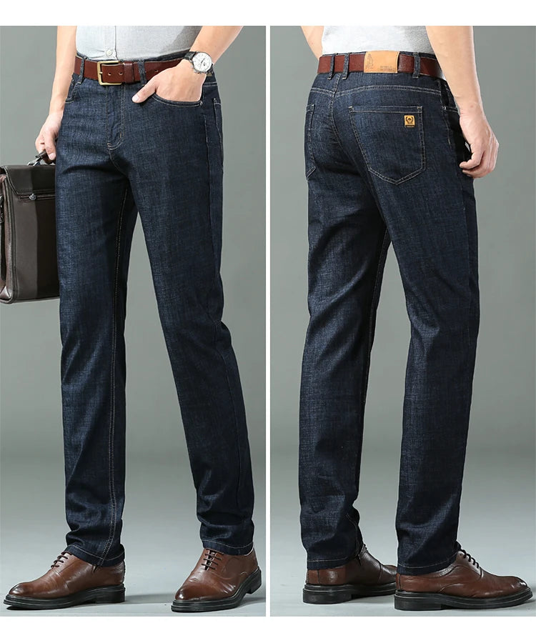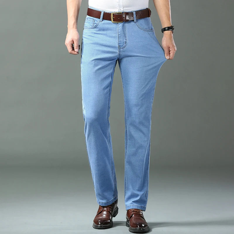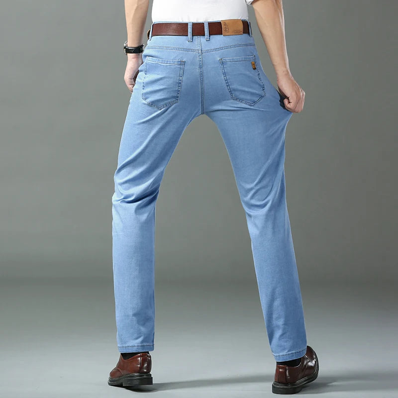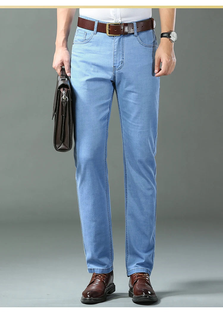 2023 Spring/summer Lightweight Fit Straight Men's Jeans Classic Business Clothes Thin Cotton Elastic High Waist Casual Trousers