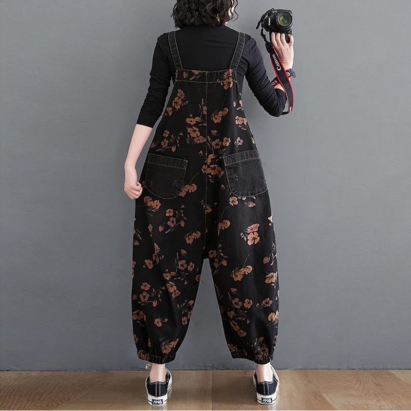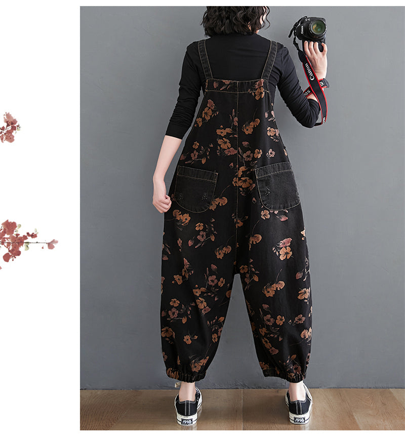 Detail Design: Print Floral Suspender Bib Baggy Pants Slacks