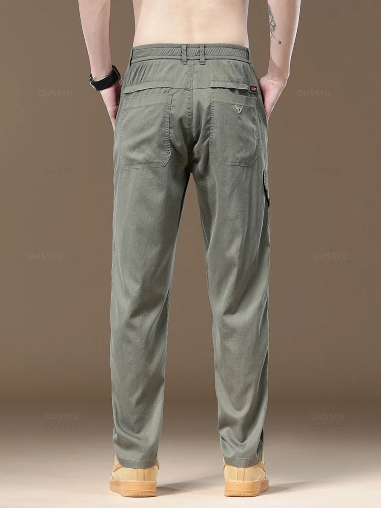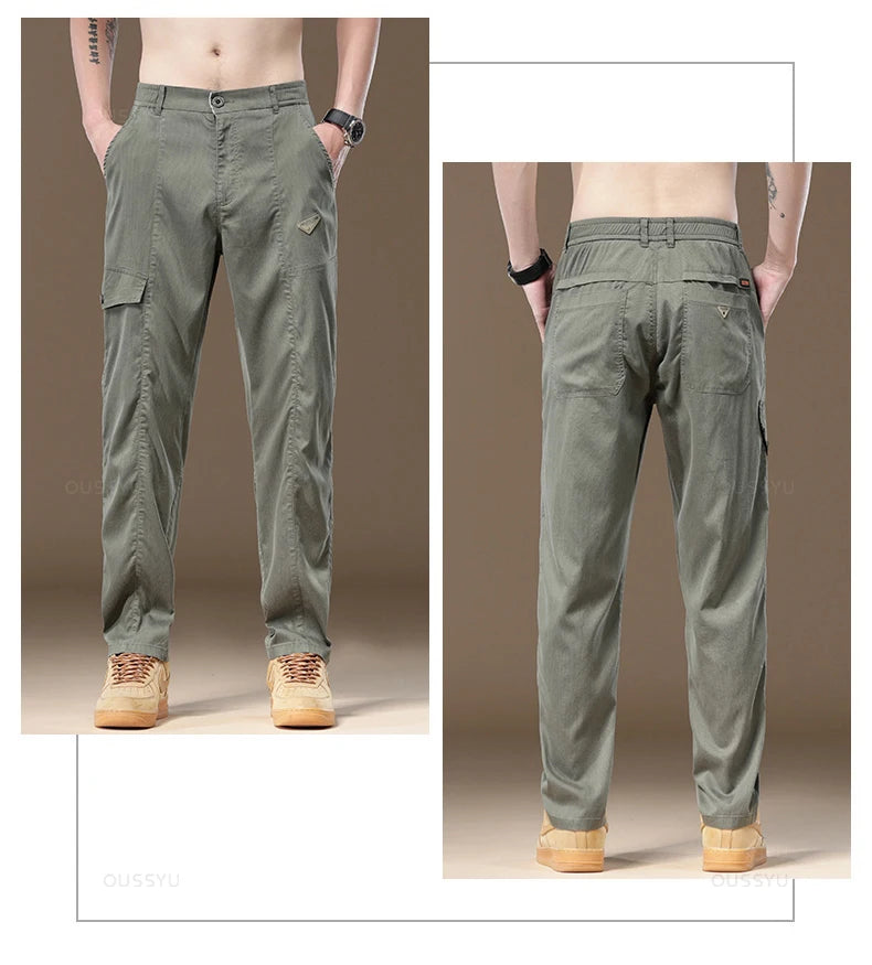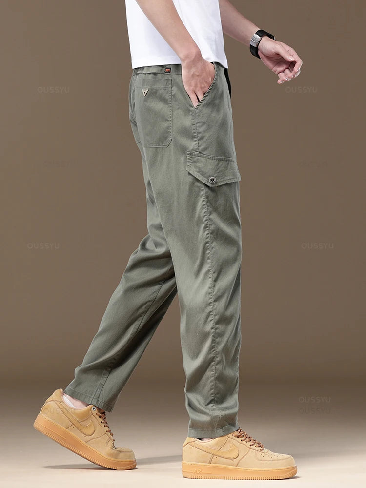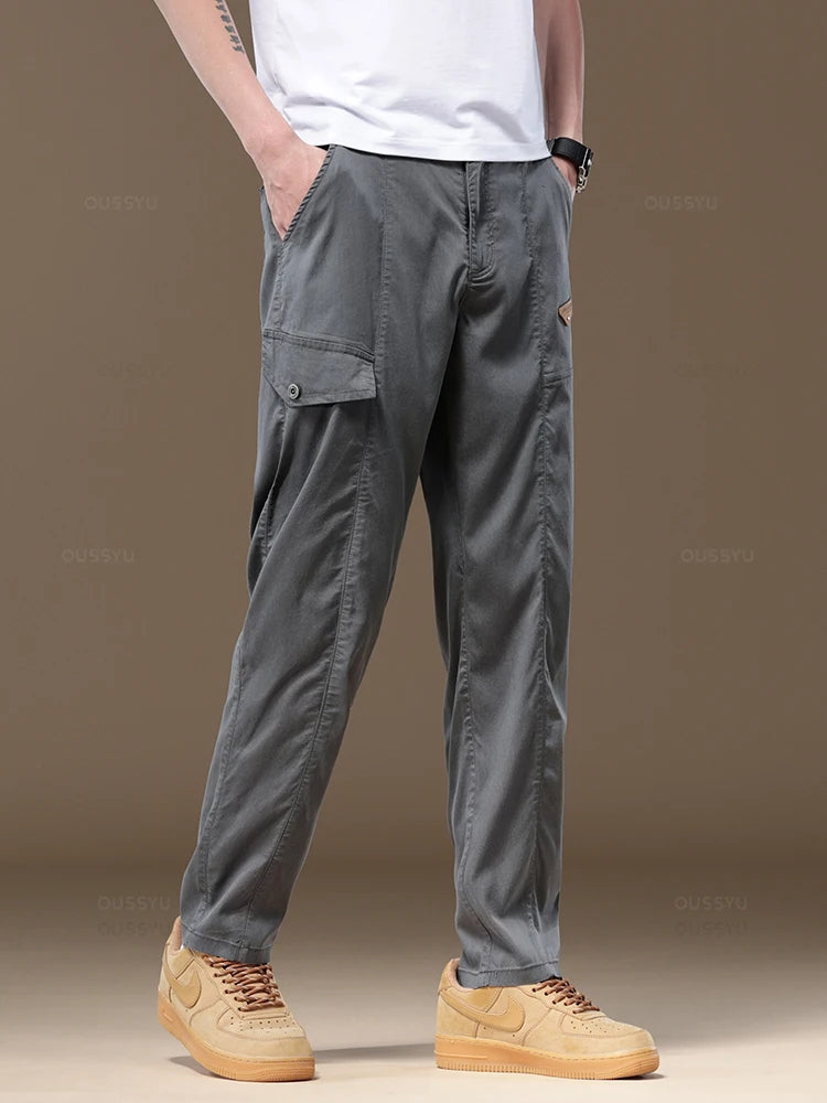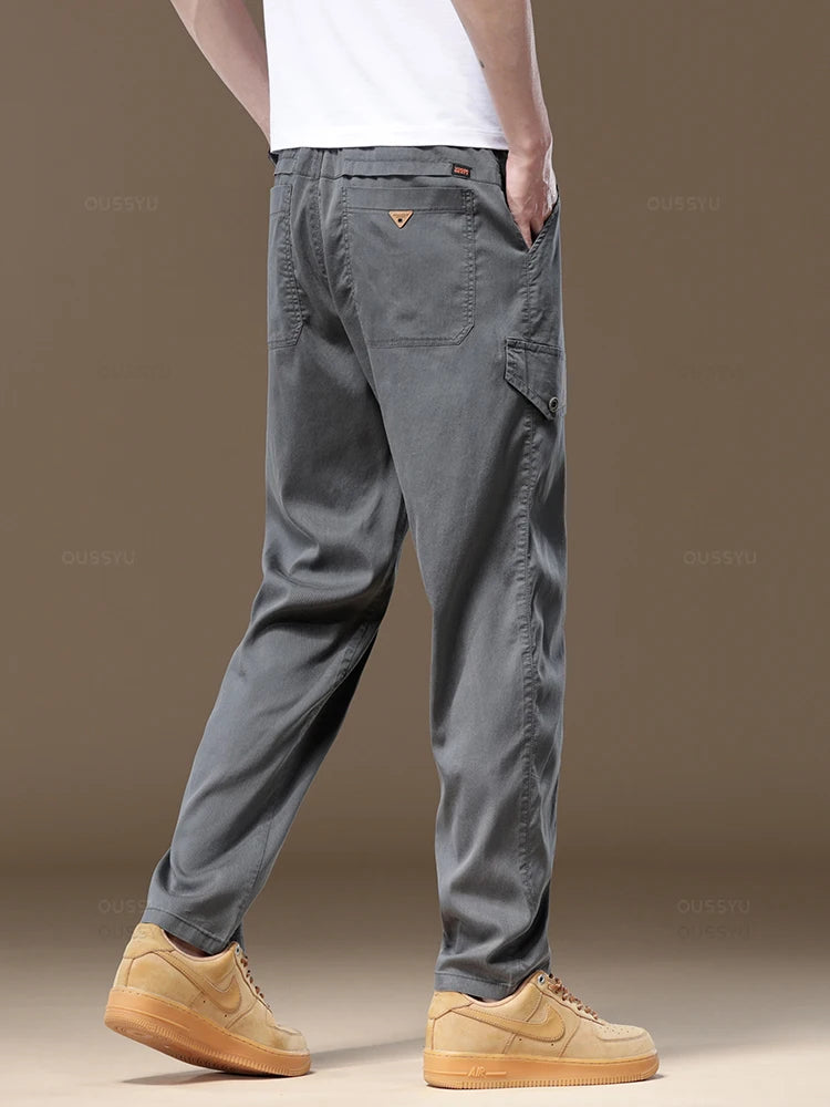 Summer Soft Lyocell Fabric Men's Cargo Pants Solid Color Work Wear Elastic Waist Casual Pant Korean Outdoors Jogger Trousers Man