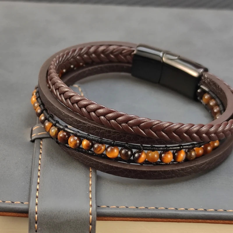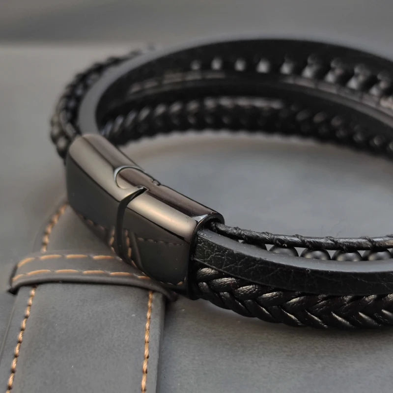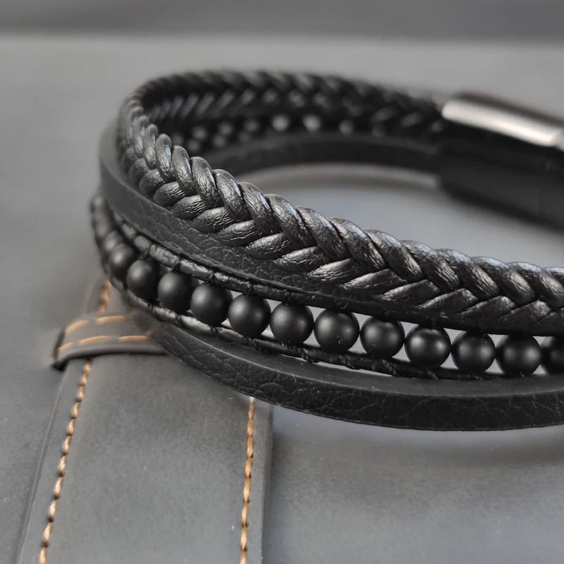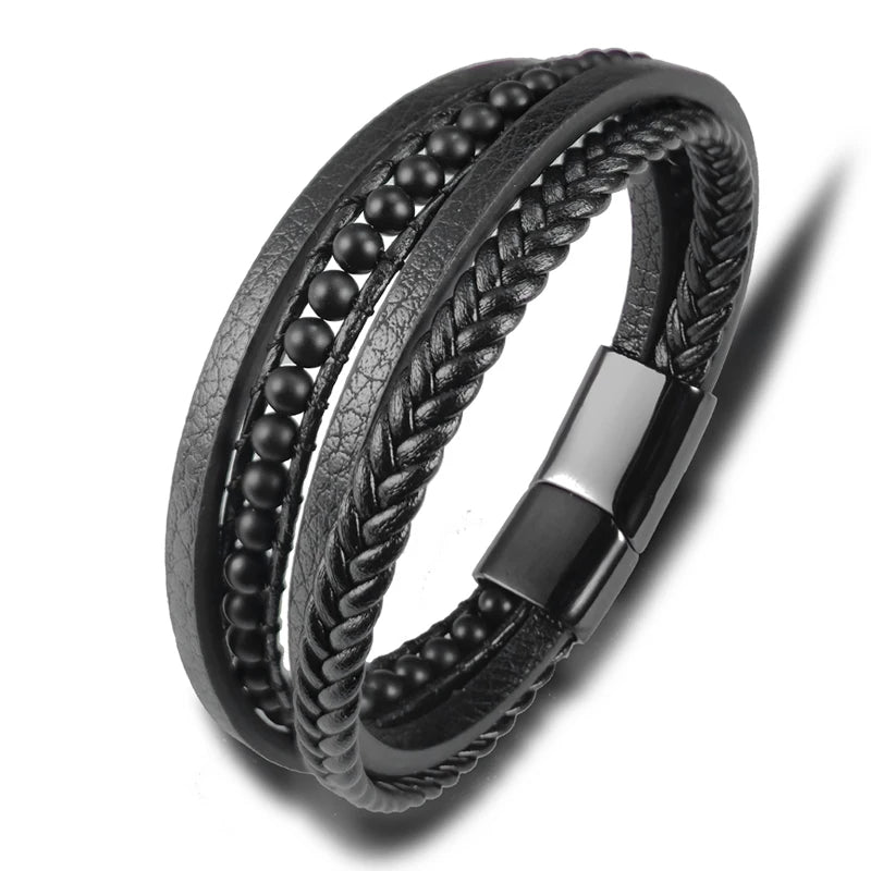 New Multilayer Stainless Steel Insert Bracelet Beads Leather Bracelets for Men Braided Bangles Punk Jewelry Homme Accessories