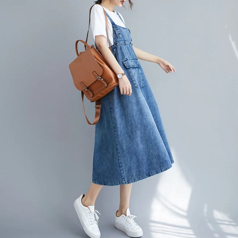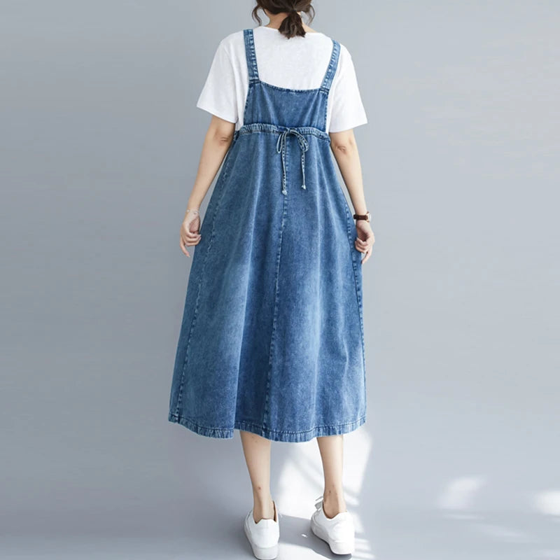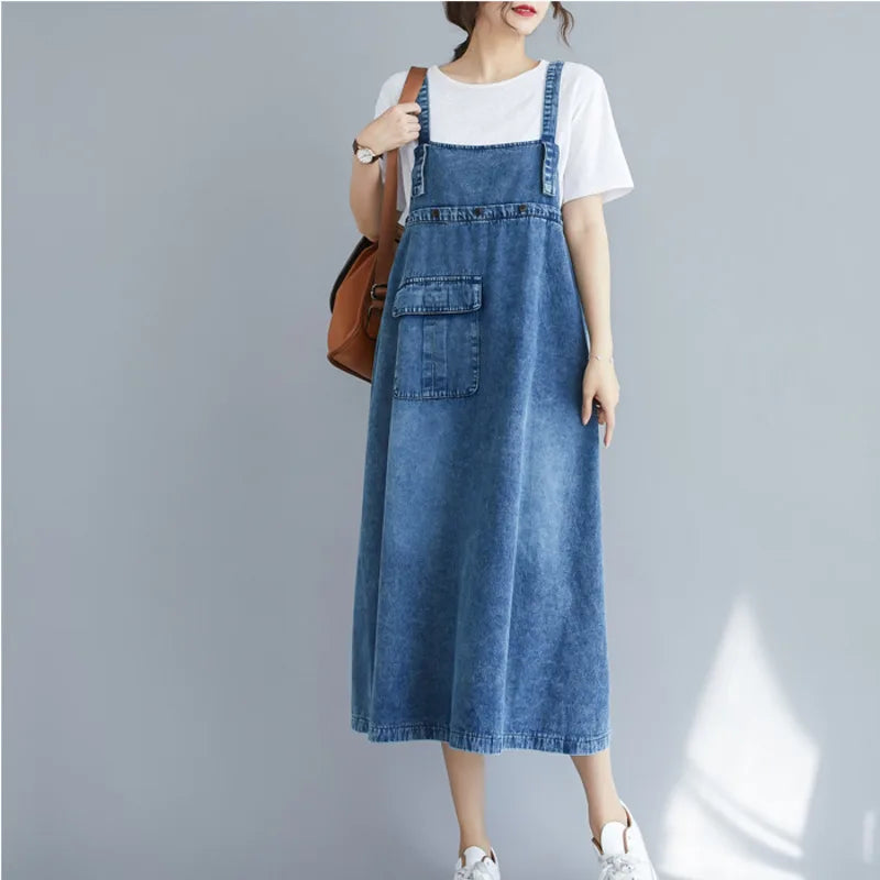 #2107 Summer Overalls Spaghetti Straps Dress Vintage Sleeveless Denim Dresses Women Loose A-line Midi Dress Female With Pockets