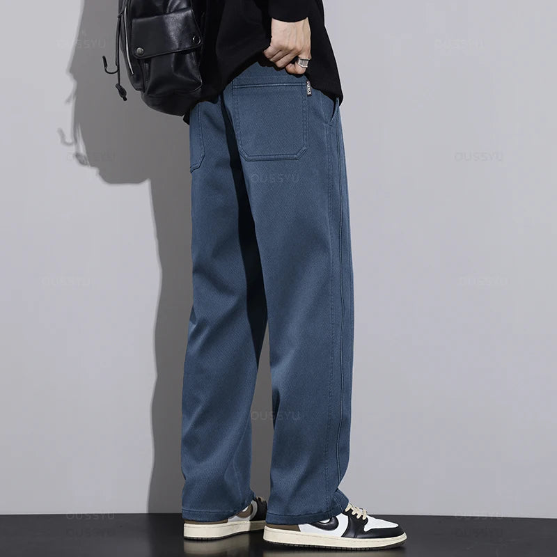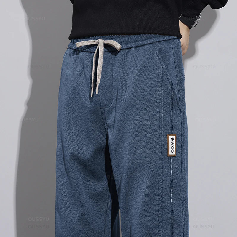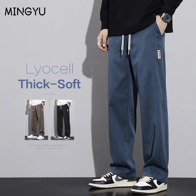 New Winter High Quality Soft Lyocell Fabric Blue Pants Men Elastic Waist Straight Korean Thick Work Cargo Jogger Trousers Male