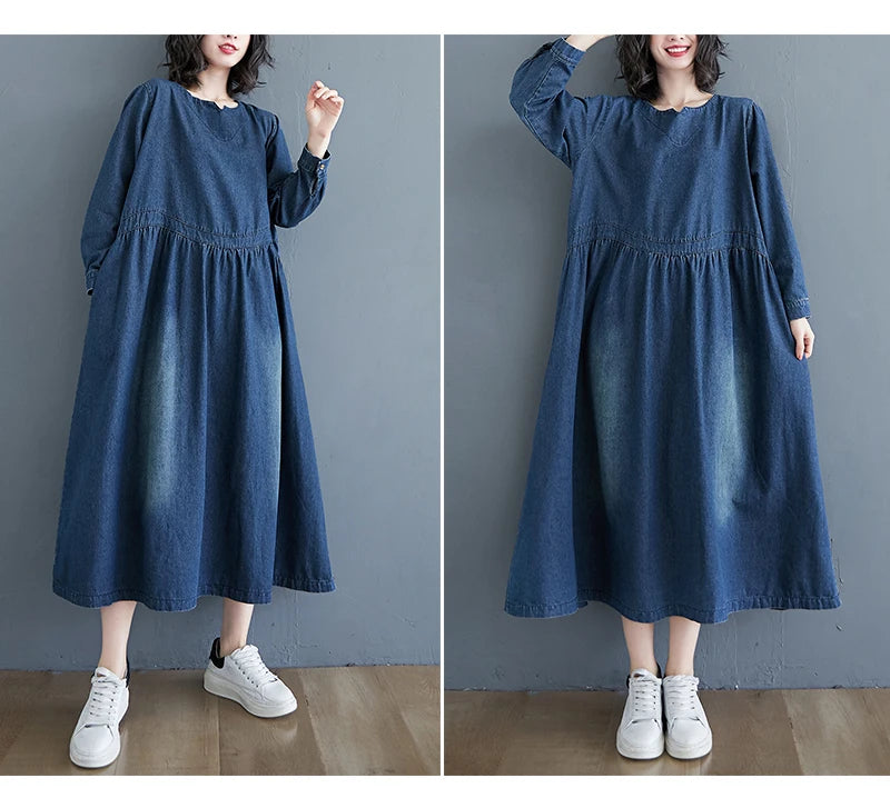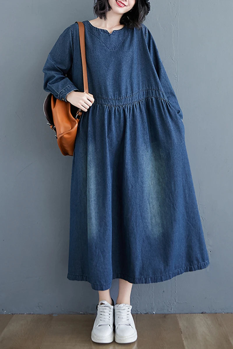 New Patchwork Pleated Vintage Washed Women Denim Dresses With Pockets Small v-Neck Temperament Office Lady Loose Female Frocks