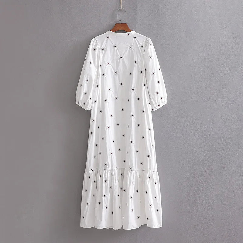 TEELYNN puff sleeve midi women dresses vintage polka dot dress white cotton floral embroidery summer dress casual party vestidos