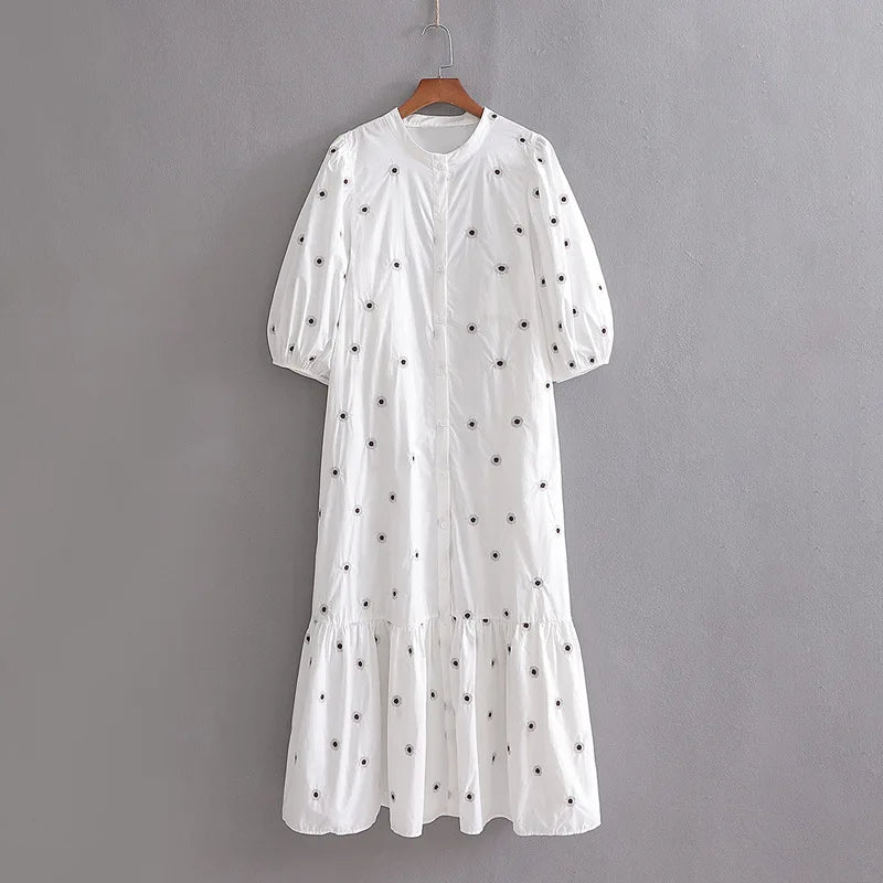 TEELYNN puff sleeve midi women dresses vintage polka dot dress white cotton floral embroidery summer dress casual party vestidos