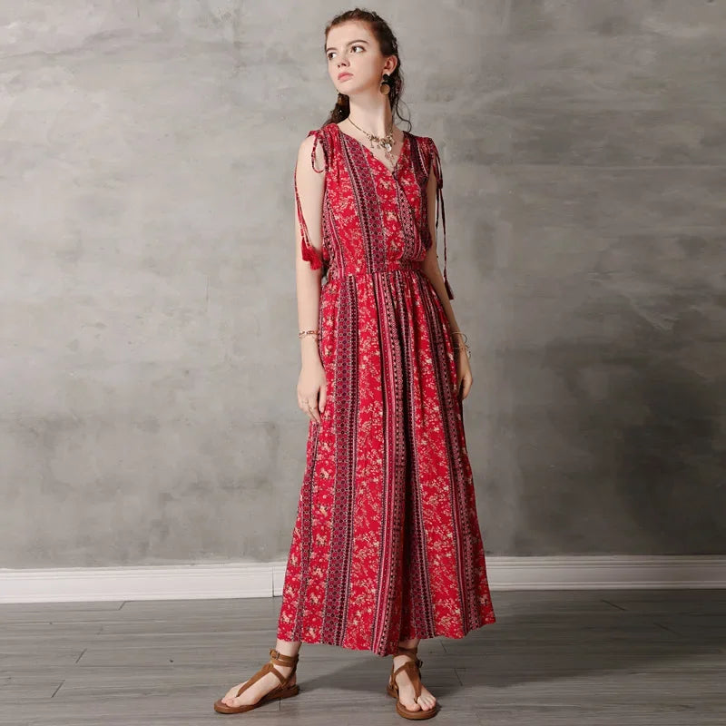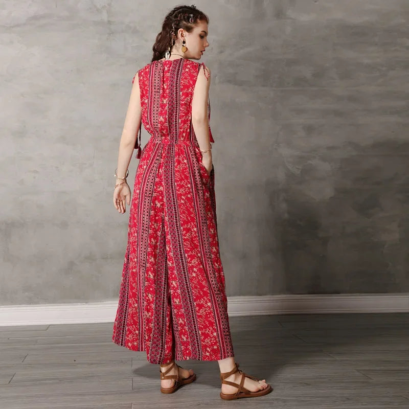 TEELYNN Red Floral Printing Jumpsuits Overalls V Neck Cotton Tsssel Boho Wind Jumpsuit Bodysuit Ethnic Vintage Lady Woman Romper