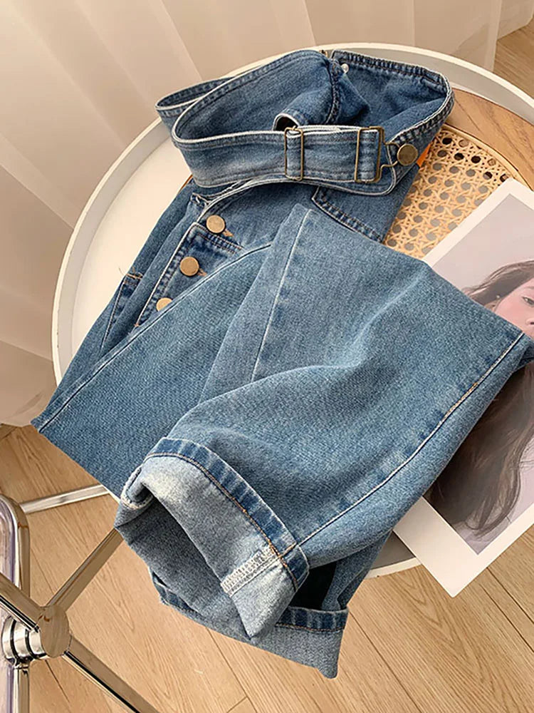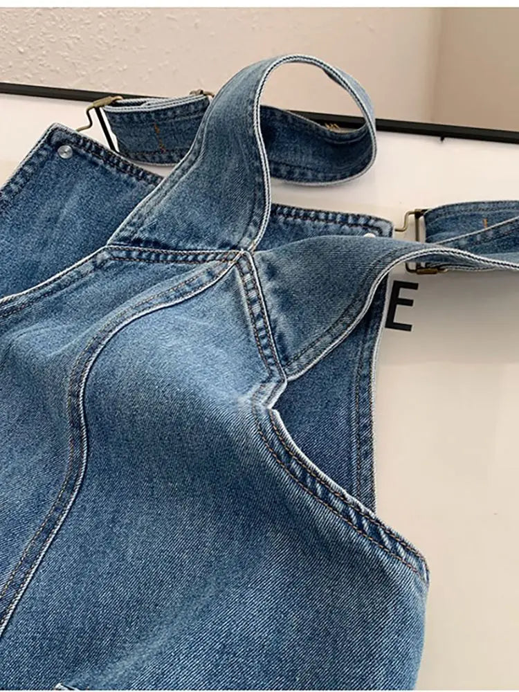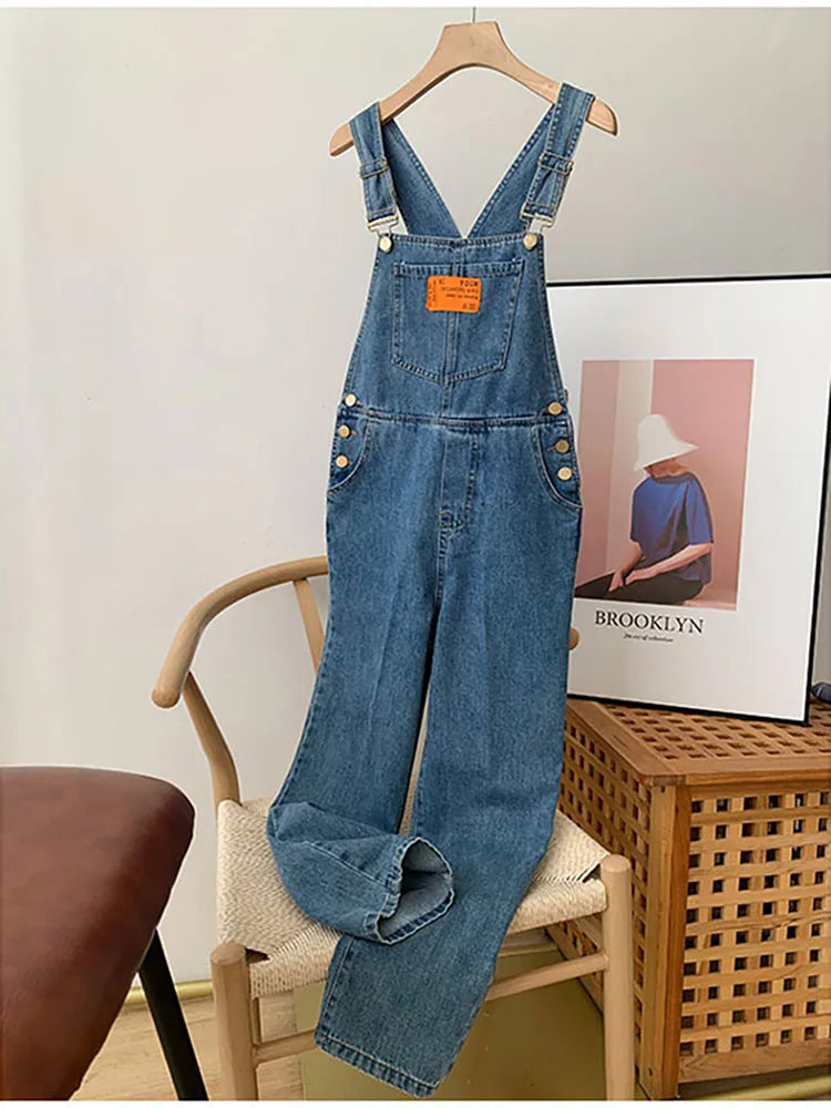 Retro Women Blue Jeans Suspender Trousers Spring Autumn Casual Loose High Waist Denim Pants Female Fashion Jumpsuit Streetwear
