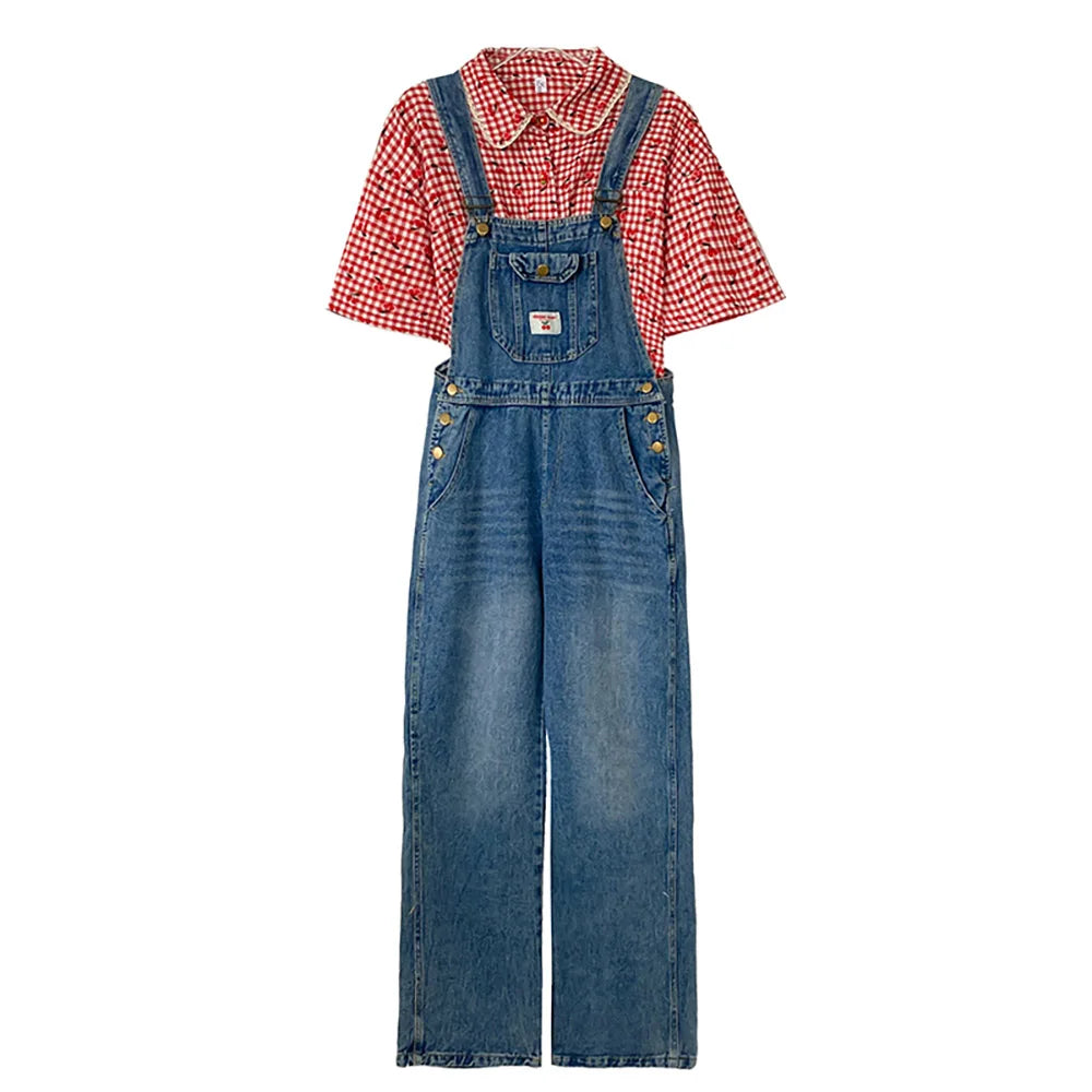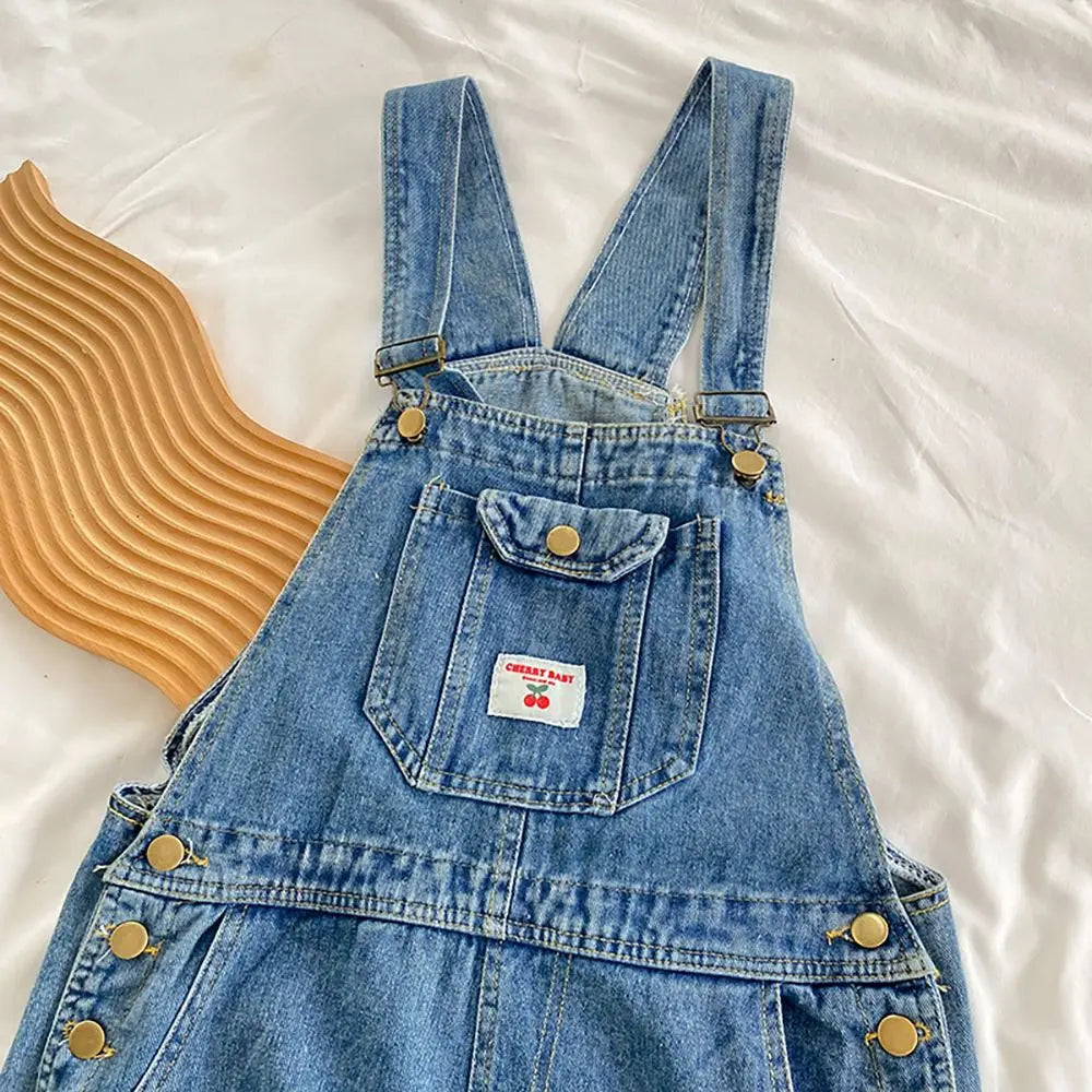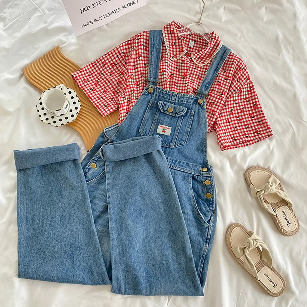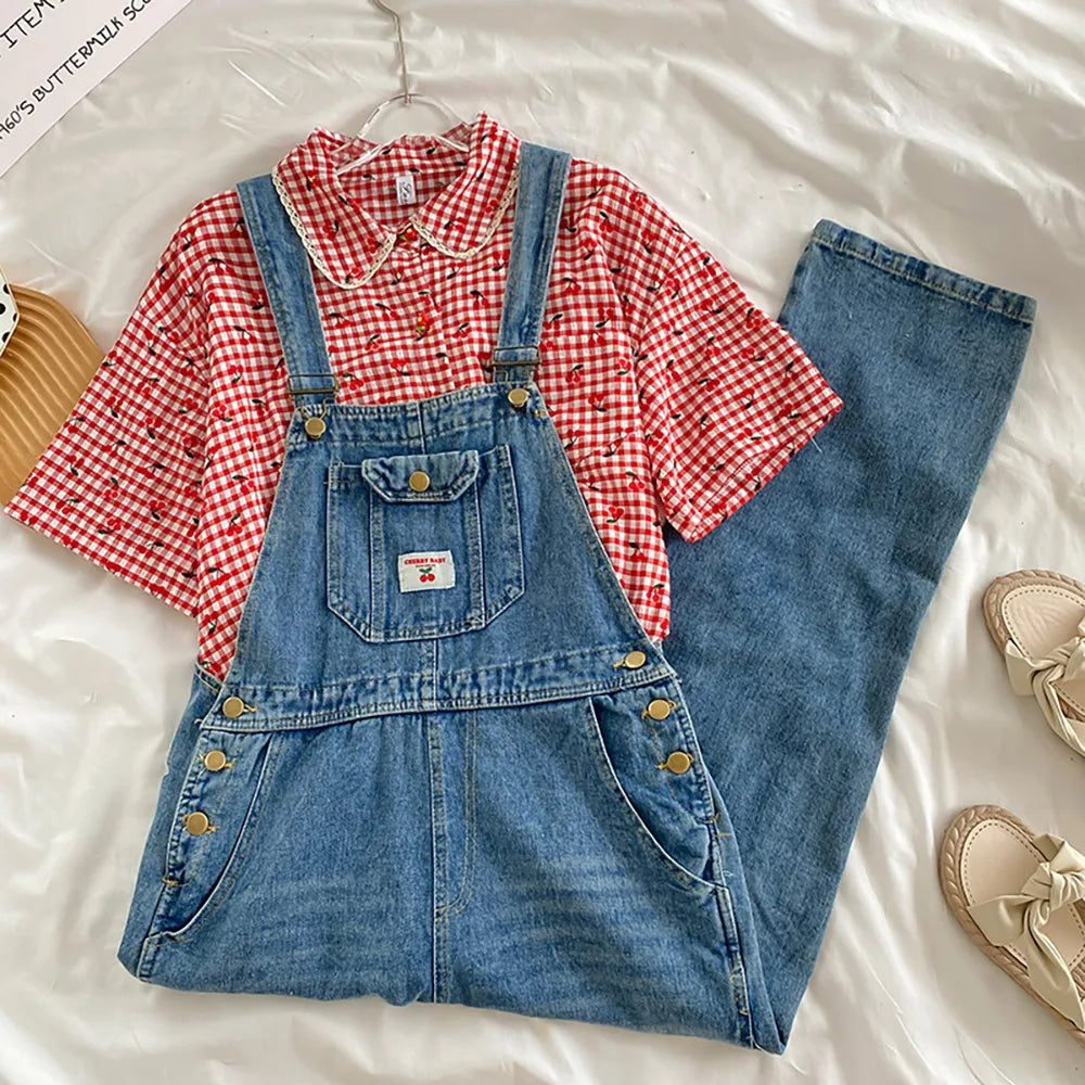 Retro Blue Strap Denim Pants for Women Cute Cherry Pattern Female Jeans Overalls Streetwear Casual Loose Girl Suspender Trousers