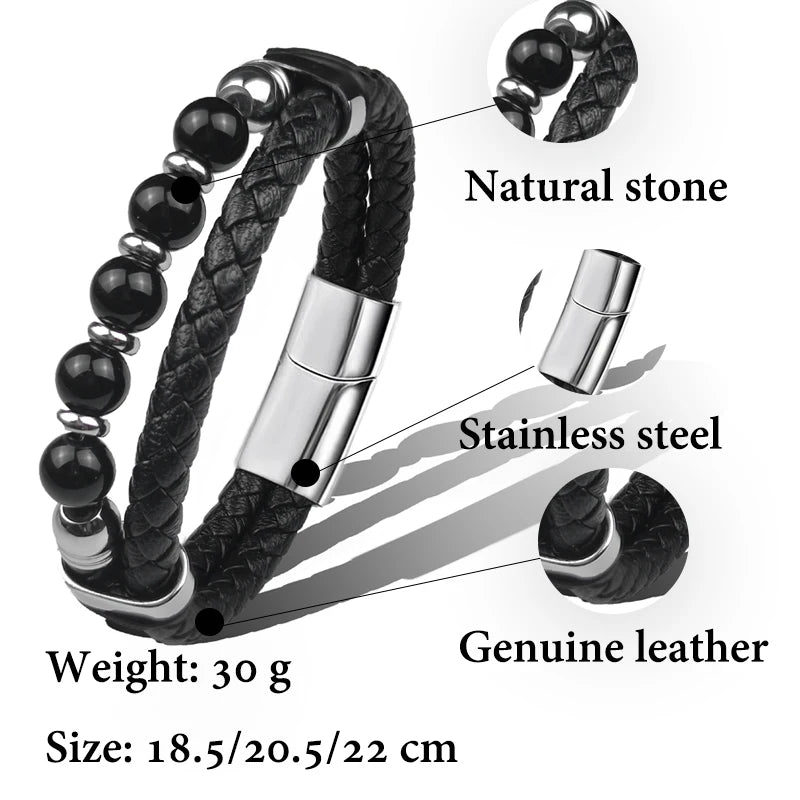 New Red Natural Round Chakra Bead Stone Men's Bracelet Classic Red Genuine Leather Stainless Steel Bangles Women Fashion Jewelry