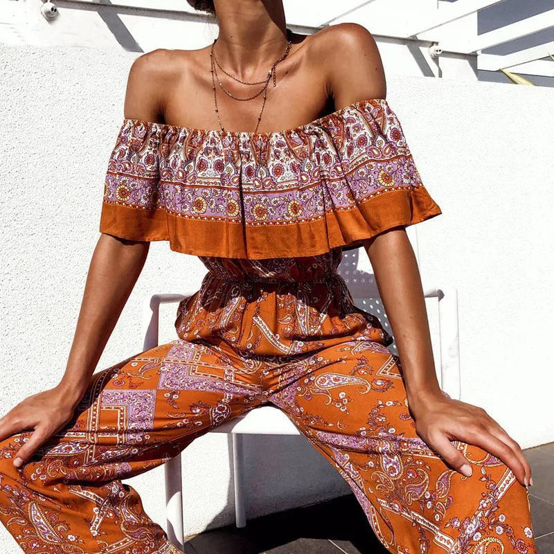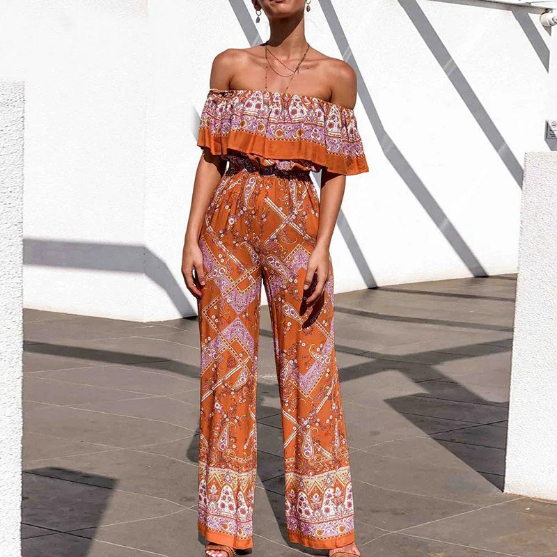 TEELYNN ruffles off shoulder women jumpsuit 2020 vintage cotton orange floral print Wide leg pants summer Rompers long jumpsuits