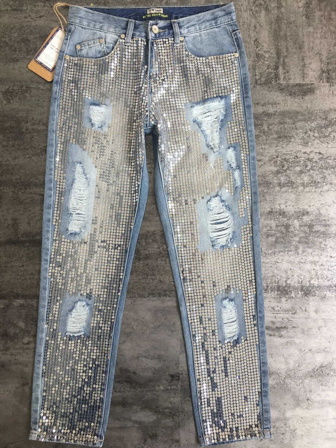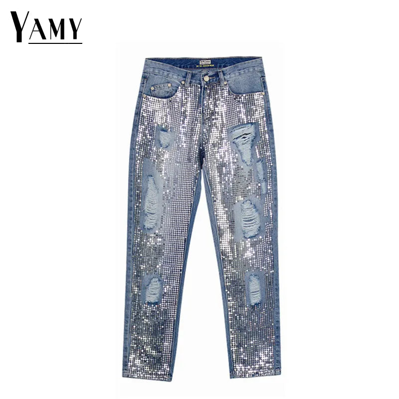 Sequin jeans woman plus size vintage mid waist hole mom boyfriend ripped jeans for women's jeans distressed denim pants