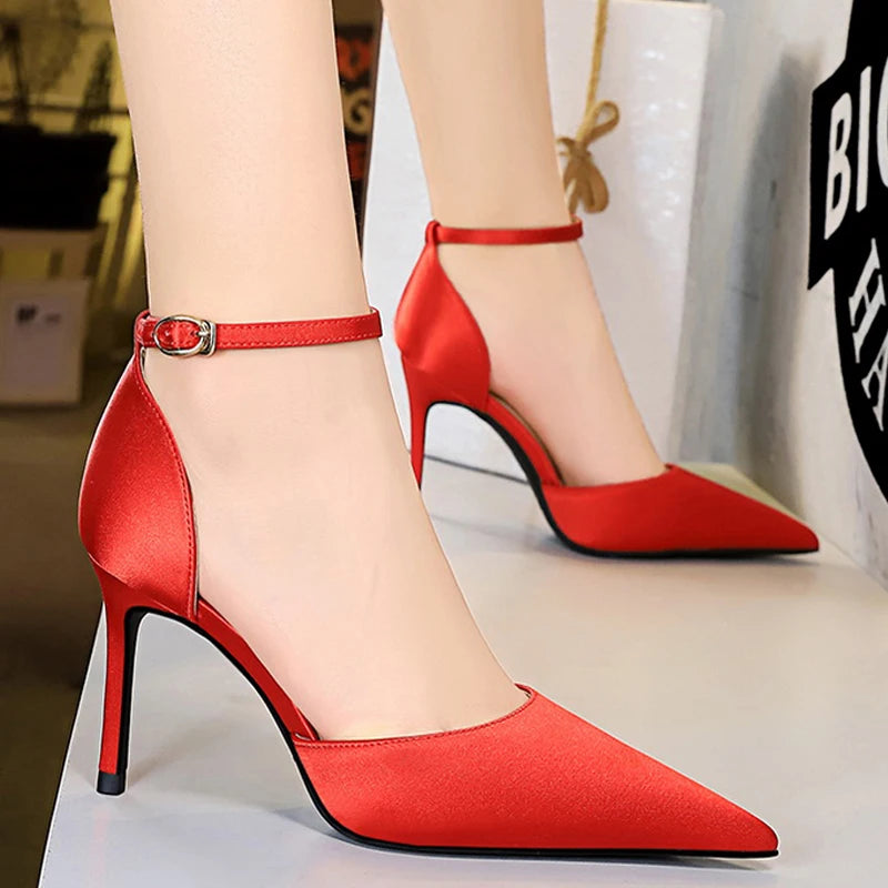 BIGTREE Shoes Summer Woman Pumps Satin Kitten Heels Fashion Wedding Shoes Stiletto Buckle High Heels Women Sandals Plus Size 43