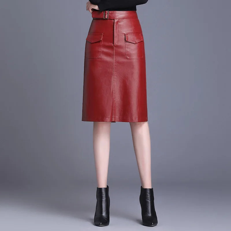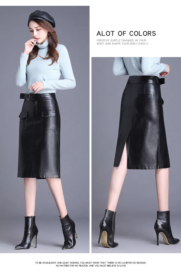 Leather Skirt Women 2022 New Spring Autumn Straight Skirts Solid Color Casual PU Leather Knee Length Skirts womens high quality