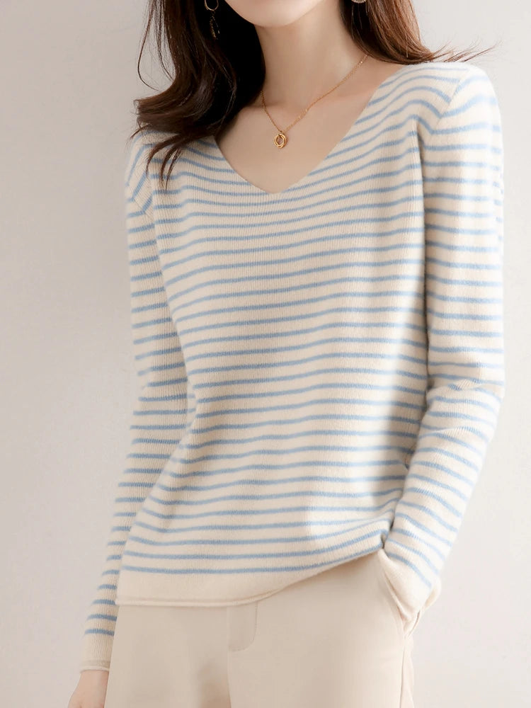 CAIXINGLE New Striped V-neck Sweater Women's All-Match Loose Sweater Fall Winter Fashion Bottoming Shirt Inner Wear Blouse