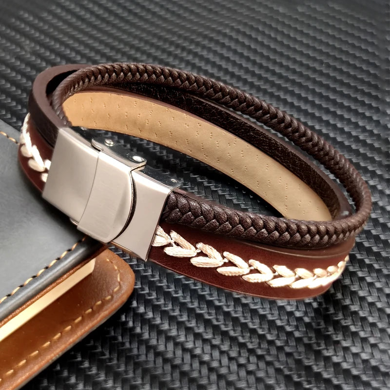 Style Brown Multilayer Man Bracelet Leather Braided Rope Stainless Steel Clasp Hand Bracelets Fashion Men Jewelry