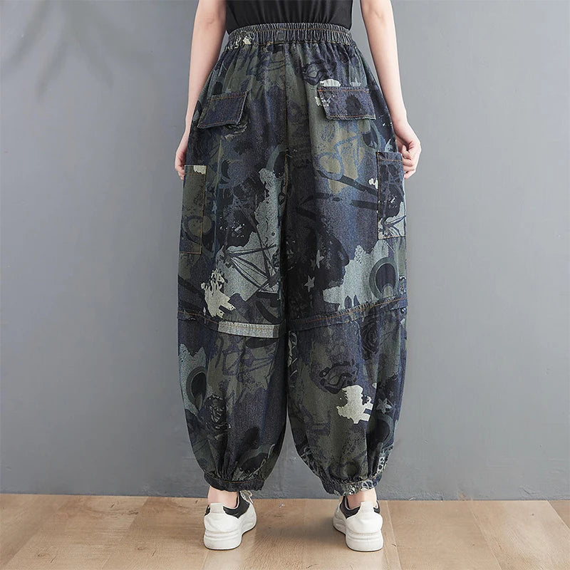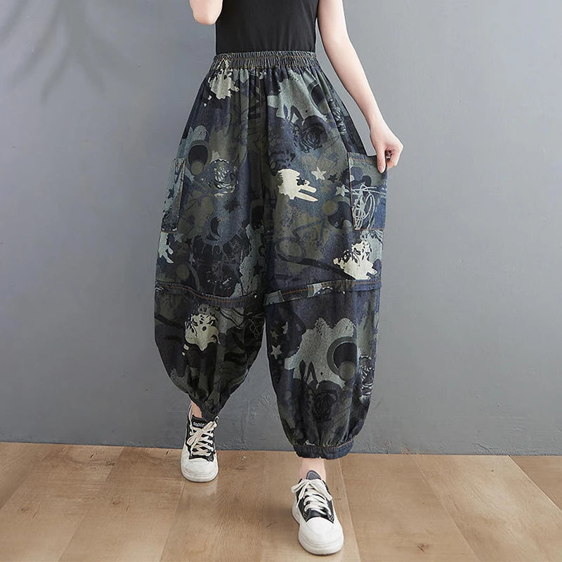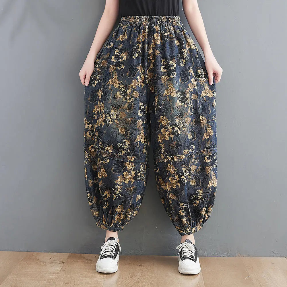 2022 Spring New Arts Style Women Elastic Waist Ankle-length Loose Jeans Side Pocket Vintage Print Cotton Denim Harem Pants V918