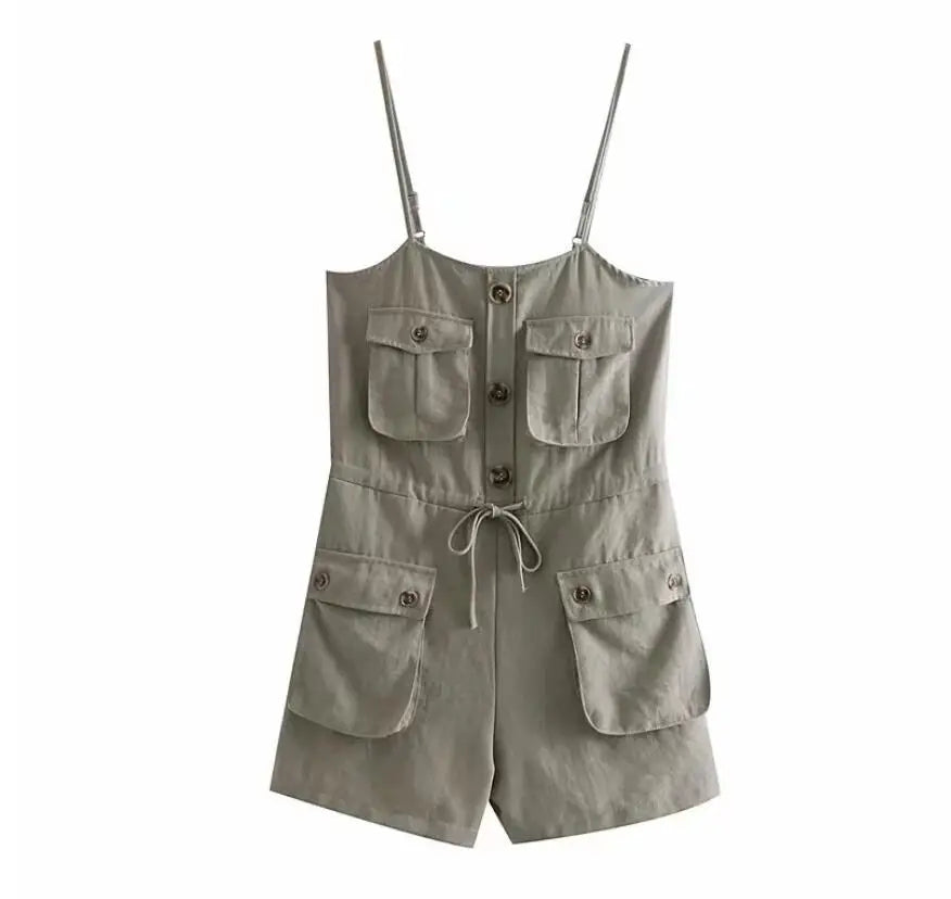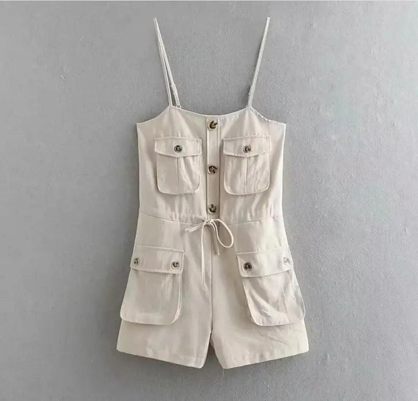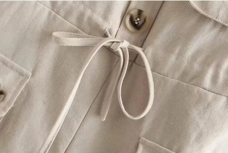 2019 Safari Style Spaghetti Strap Jumpsuit Women Open Button Lacing up Bow Waist Short Pants Romper Cotton Linen Playsuits