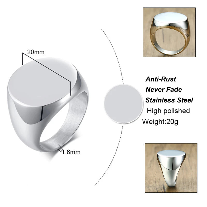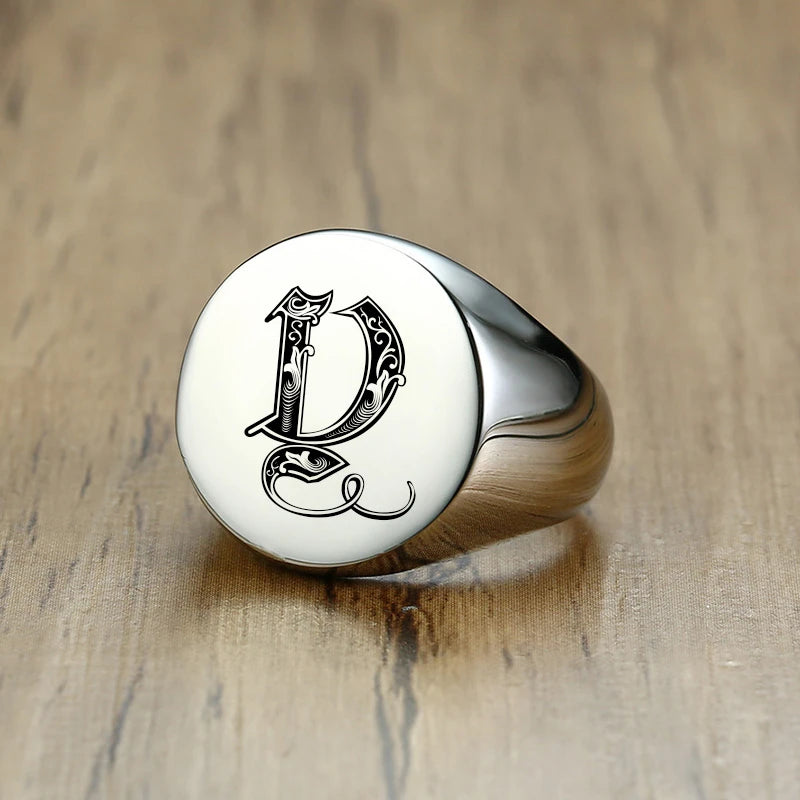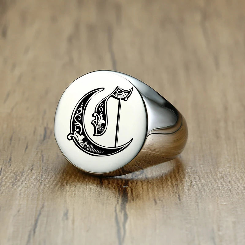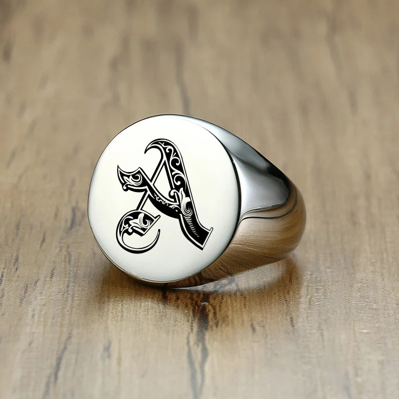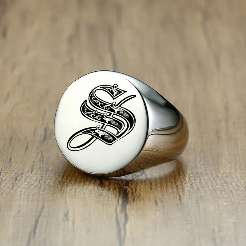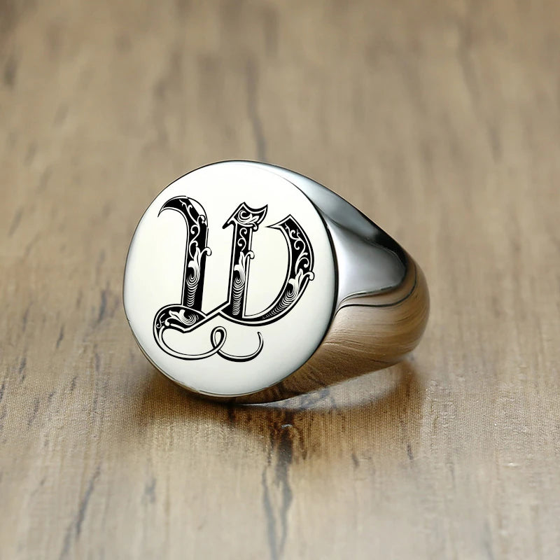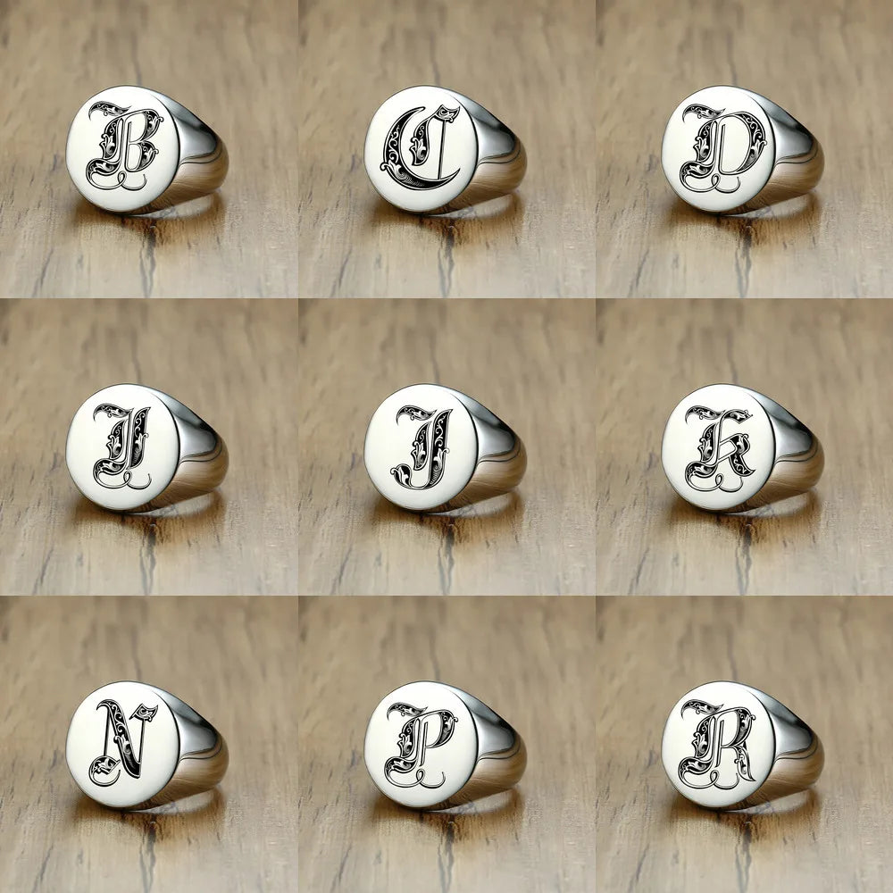 Vnox Stylish Pattern Font Initial Stamp Rings for Men Letter Engraved Stainless Steel Punk Signet Band Rock Heavy Bulk Jewelry
