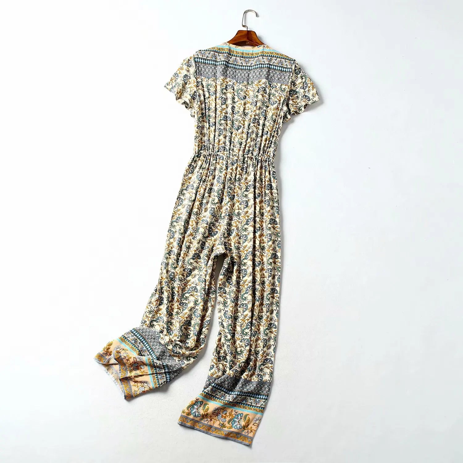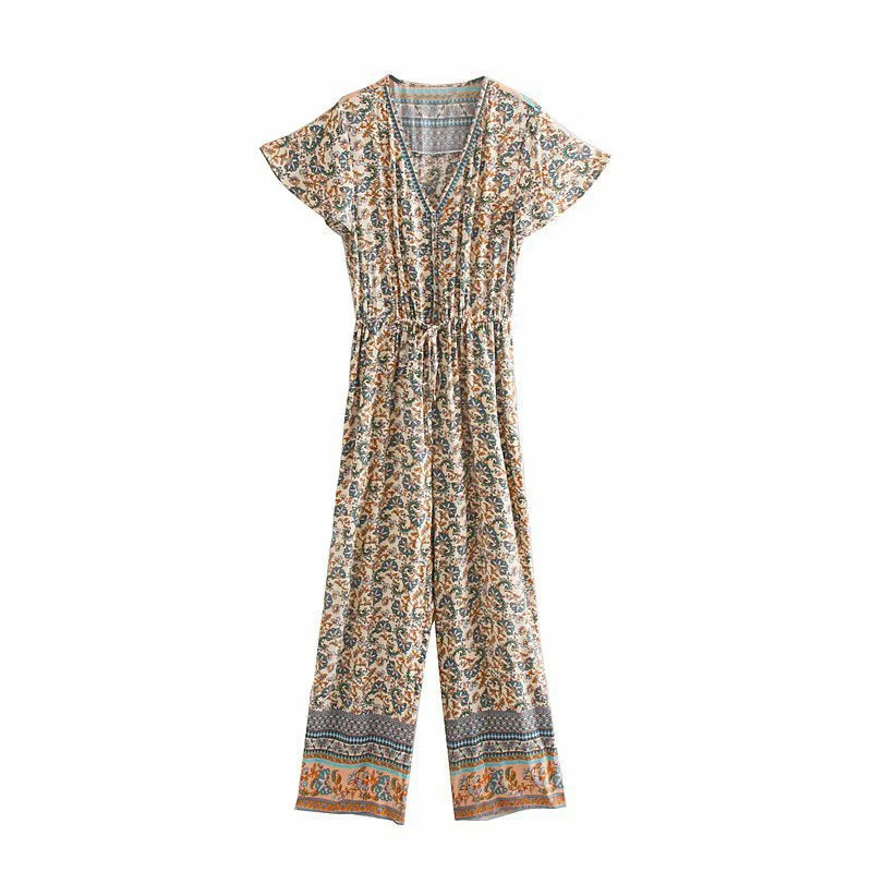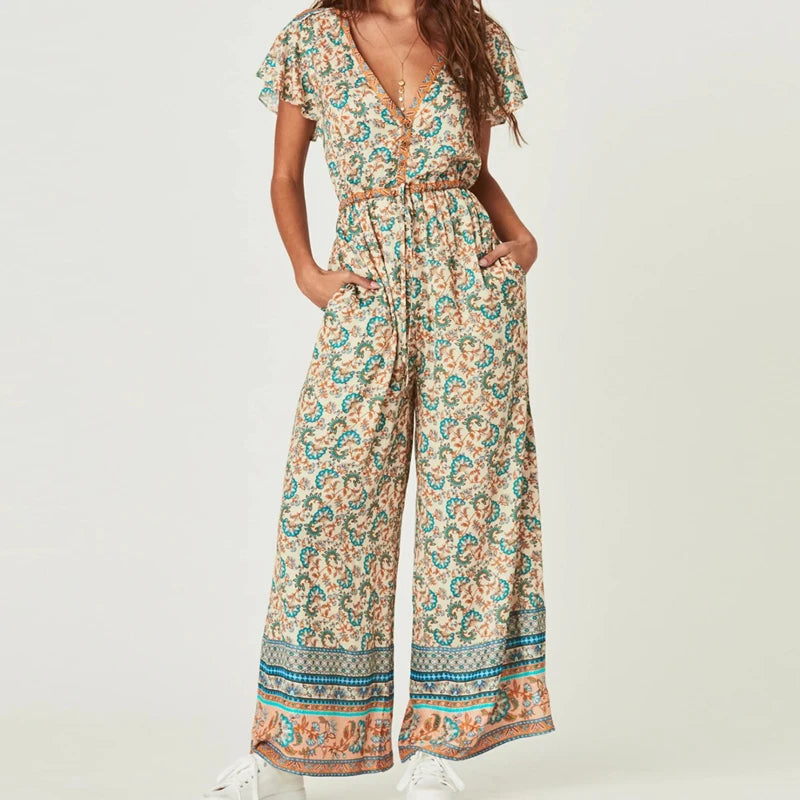 TEELYNN red Summer jumpsuit Women Ruffle sleeve V-Neck boho Wide leg jumpsuit Floral Print romper beach playsuit gypsy jumpsuits